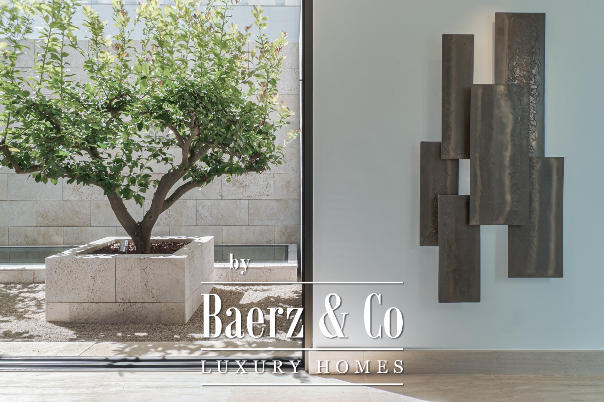 Five refined bedrooms, an open-plan kitchen and dining area, and generous lounges exhibit restraint and clarity of design. Wellness is prioritized with a spa, gym, sauna, and cold plunge pool on the lower level, creating a sanctuary for both relaxation and private gathering. Landscaped gardens by Rocío Sainz de Rozas frame the villa with mature olive trees and indigenous Mediterranean botanicals, enhancing the visual harmony of indoor and outdoor spaces.