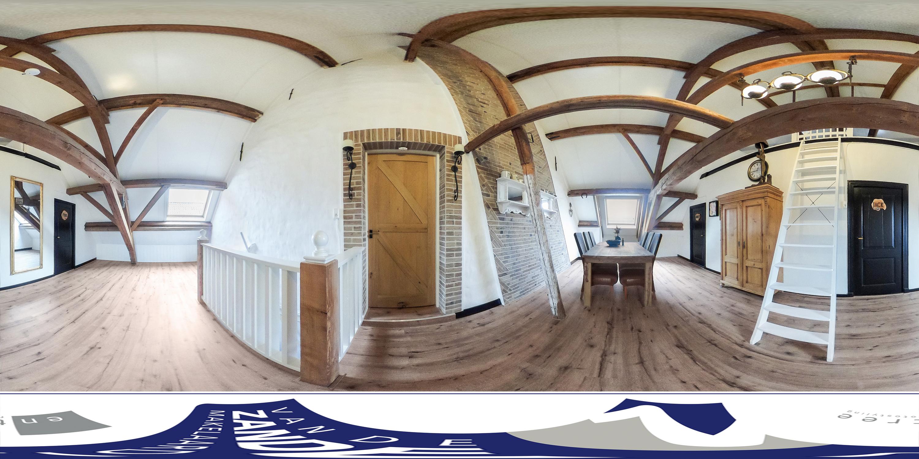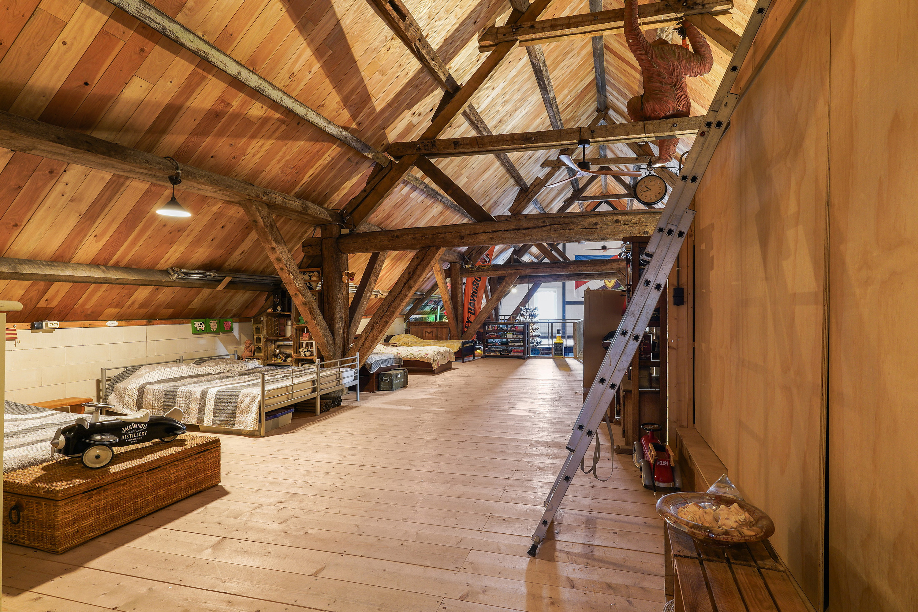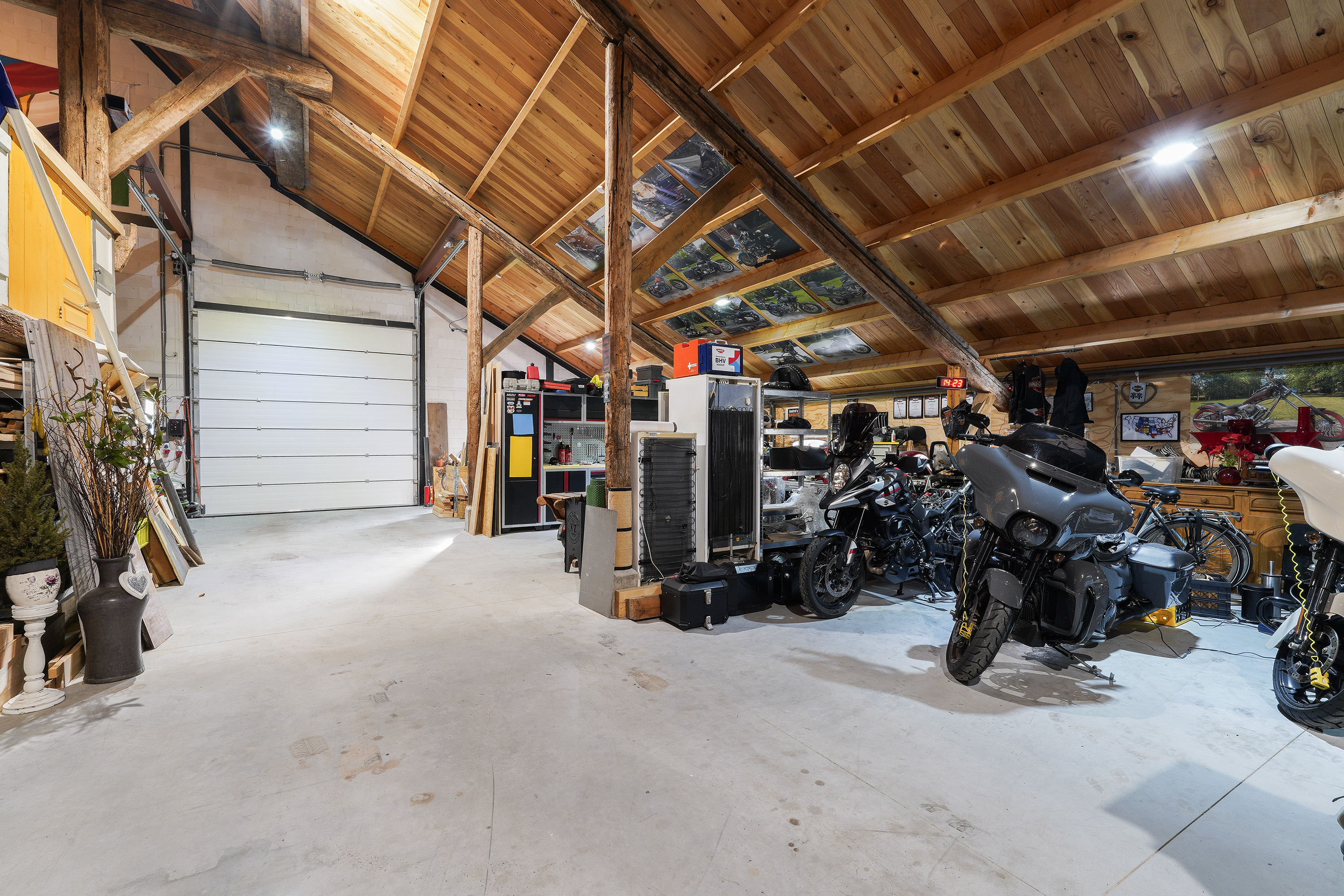 De aangrenzende garage doet zijn naam geen eer aan. Met een oppervlakte van circa 160 m², een grote sectionaaldeur aan de achterzijde van 3,5 meter breed én hoog, een vliering en extra inpandige ruimtes is dit een droom voor liefhebbers van auto’s, stallen van een camper, verzamelaars of hobbyisten. Een grote bus rijdt hier moeiteloos naar binnen. En dan hebben we het nog niet eens over de overige inpandige ruimtes gehad, want met de zolder boven de bar beschikt de woning in het geheel over ruim 300 m² aan extra ruimte naast de woonoppervlakte.