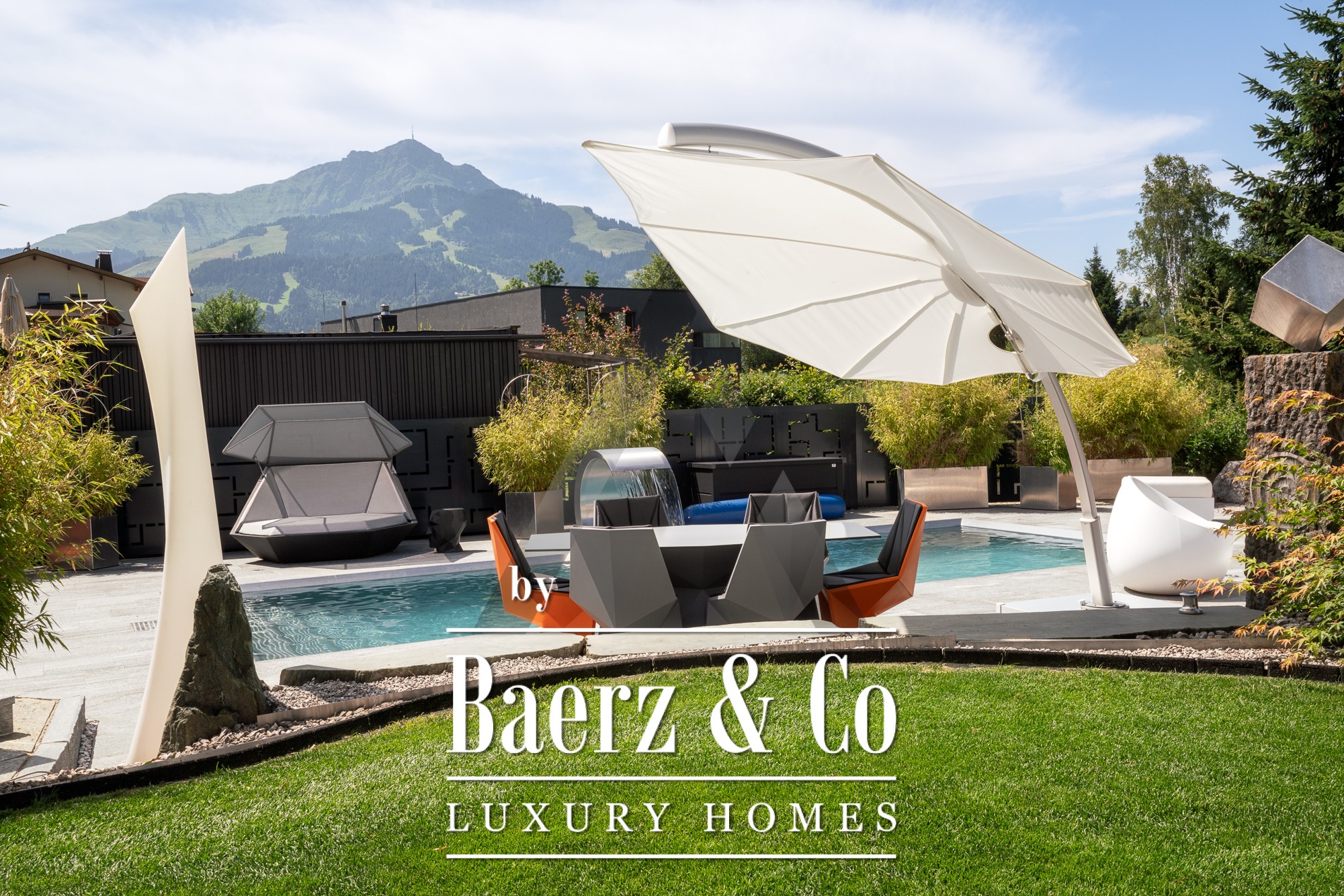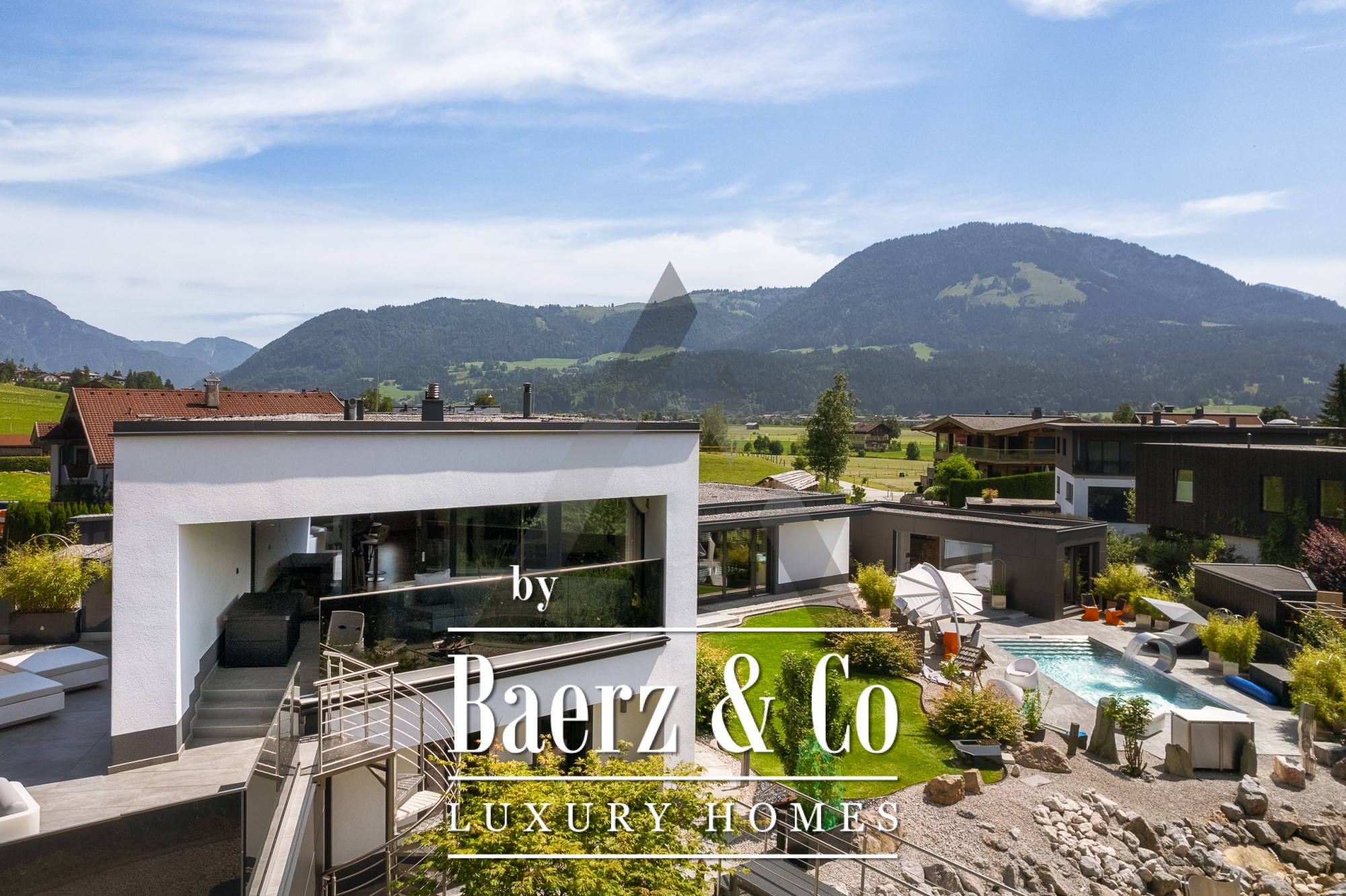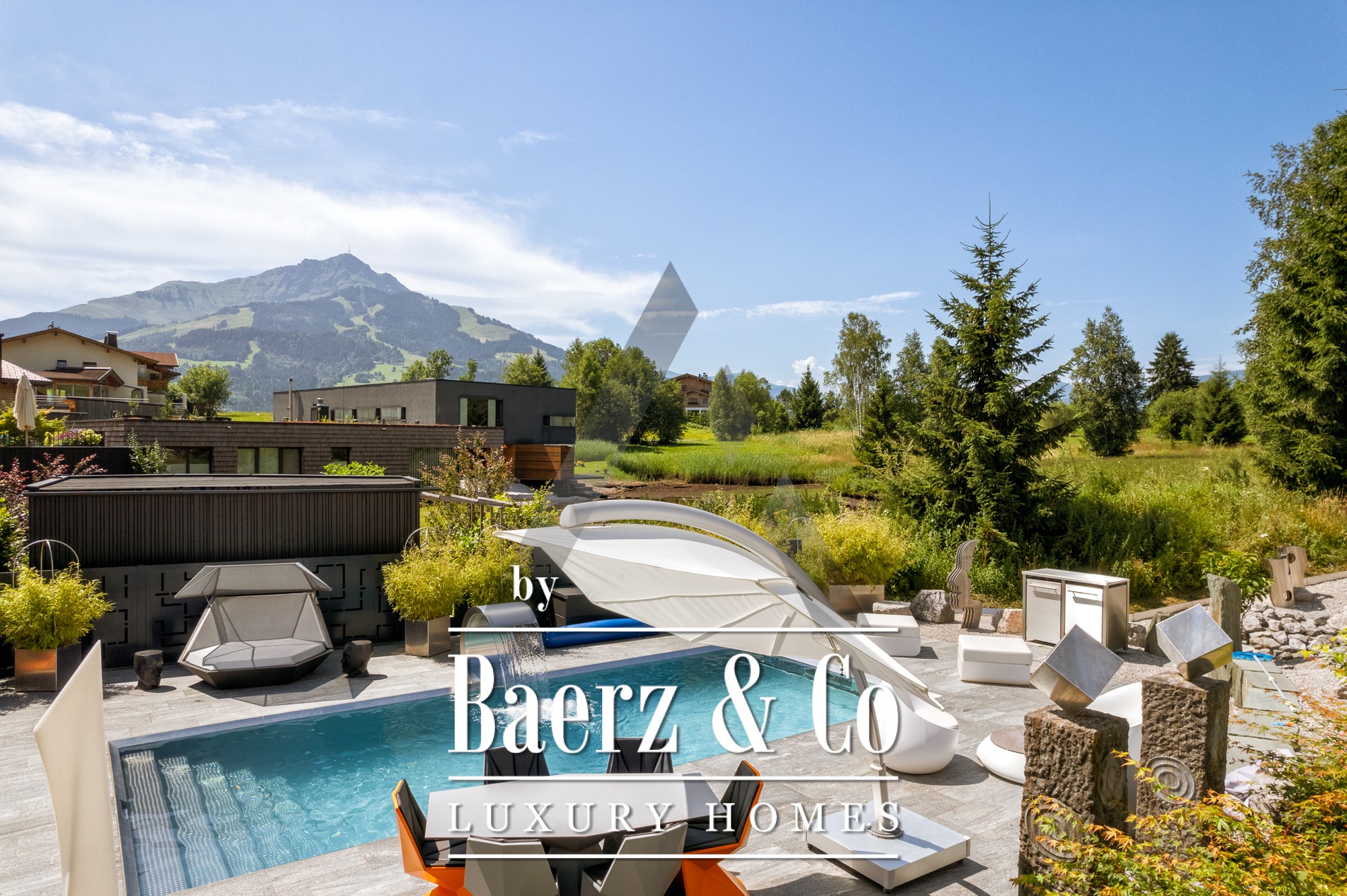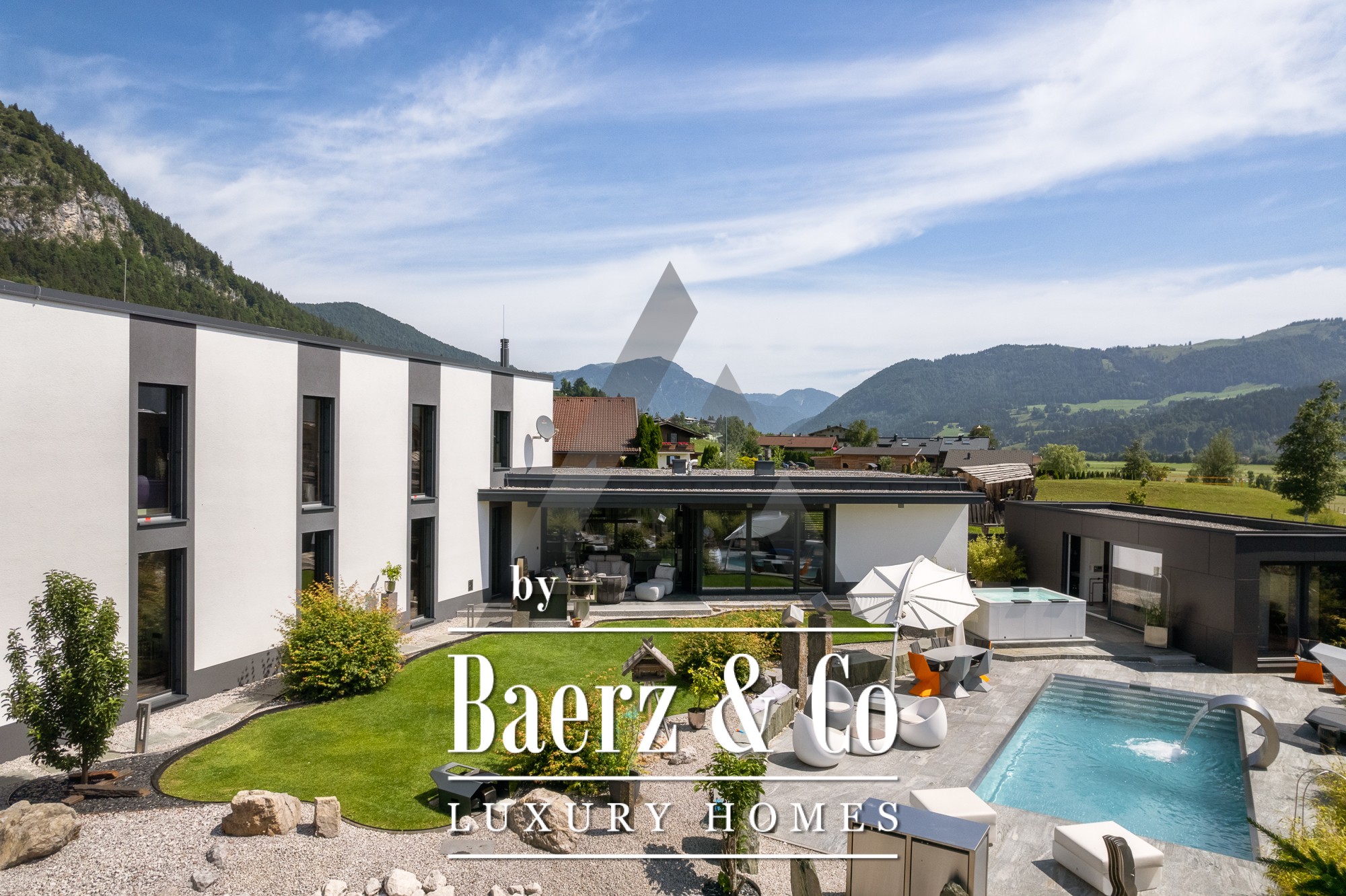 Detached house St. Johann in Tirol is set in a tranquil, sun-drenched position, offering sweeping views of the Kitzbühel Horn and Wilder Kaiser mountains. This contemporary property, offering 418 m² of living space on a 1,186 m² plot, captures the essence of refined alpine living. An idyllic landscape unfolds with a pond, landscaped streams, expansive terraces, and panoramic mountain vistas. The outdoor realm is enhanced by a stainless steel pool, a Treesse designer whirlpool, and a sauna, inviting leisurely mornings and restorative afternoons.