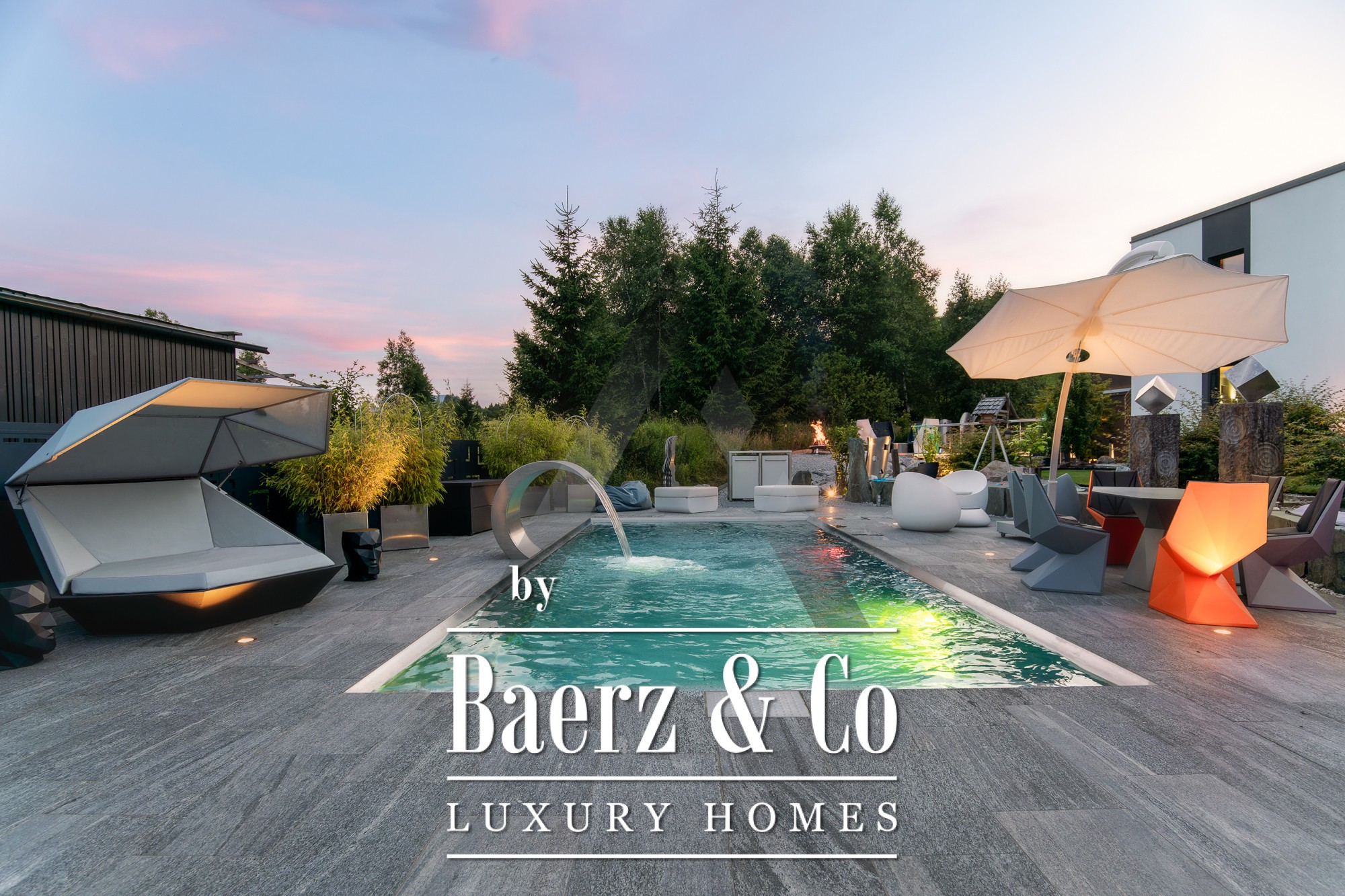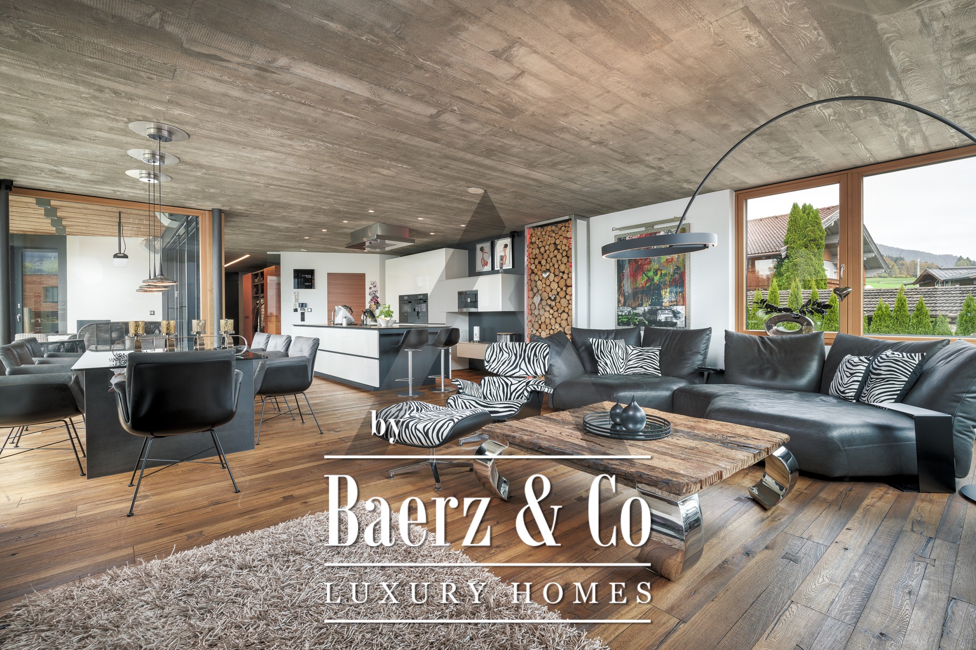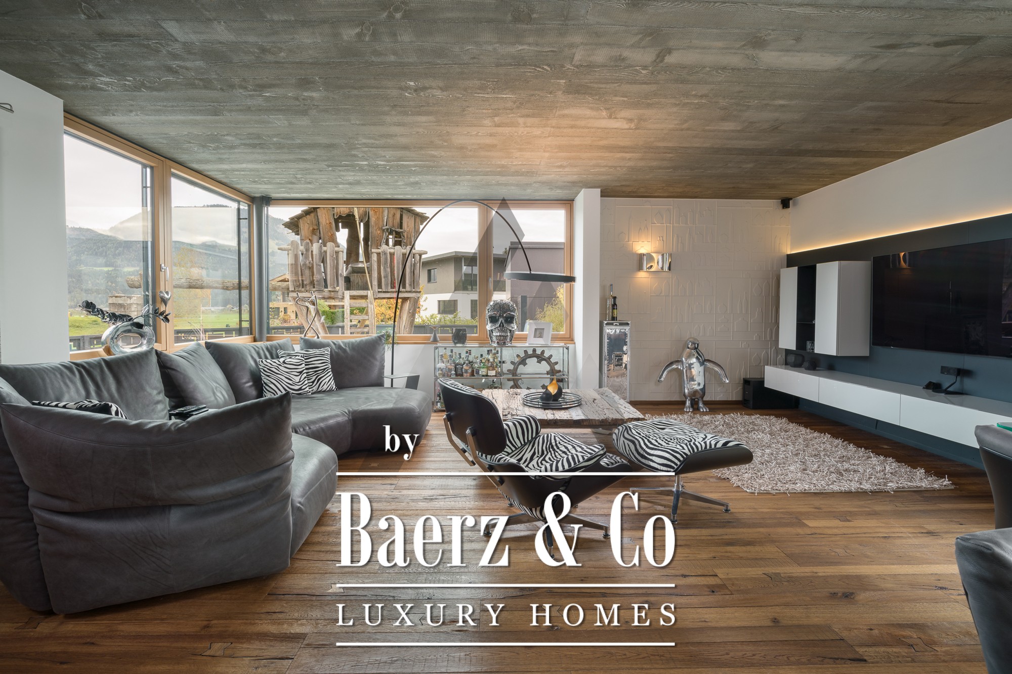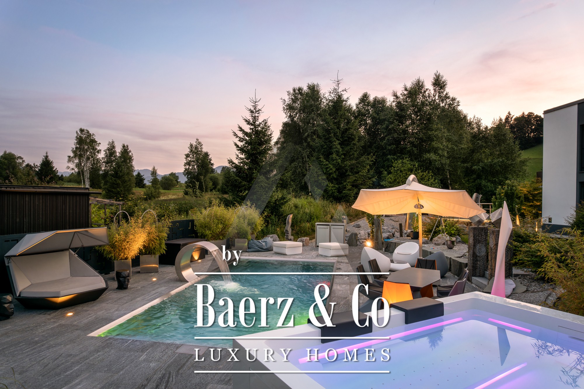 Detached house St. Johann in Tirol is set in a tranquil, sun-drenched position, offering sweeping views of the Kitzbühel Horn and Wilder Kaiser mountains. This contemporary property, offering 418 m² of living space on a 1,186 m² plot, captures the essence of refined alpine living. An idyllic landscape unfolds with a pond, landscaped streams, expansive terraces, and panoramic mountain vistas. The outdoor realm is enhanced by a stainless steel pool, a Treesse designer whirlpool, and a sauna, inviting leisurely mornings and restorative afternoons.