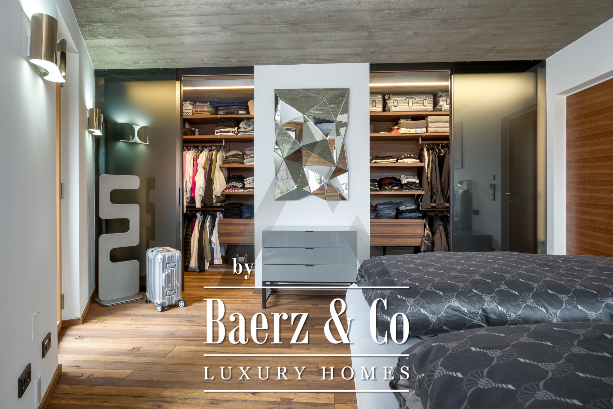 Inside, exposed concrete ceilings and reclaimed oak flooring introduce a subtle sophistication. The open-plan ground floor forms the heart of the home, where panoramic windows fill the living, dining, and designer Miele kitchen spaces with natural light. The ground level accommodates a master suite with dressing room, children's bedroom, ample bathrooms, and seamless storage. Upstairs, a separate apartment features two bedrooms, a living area with a fireplace, and a roof terrace that frames the mountain horizon. Completing the upper floor is an 18 m², fully air-conditioned fitness suite opening to its own terrace.