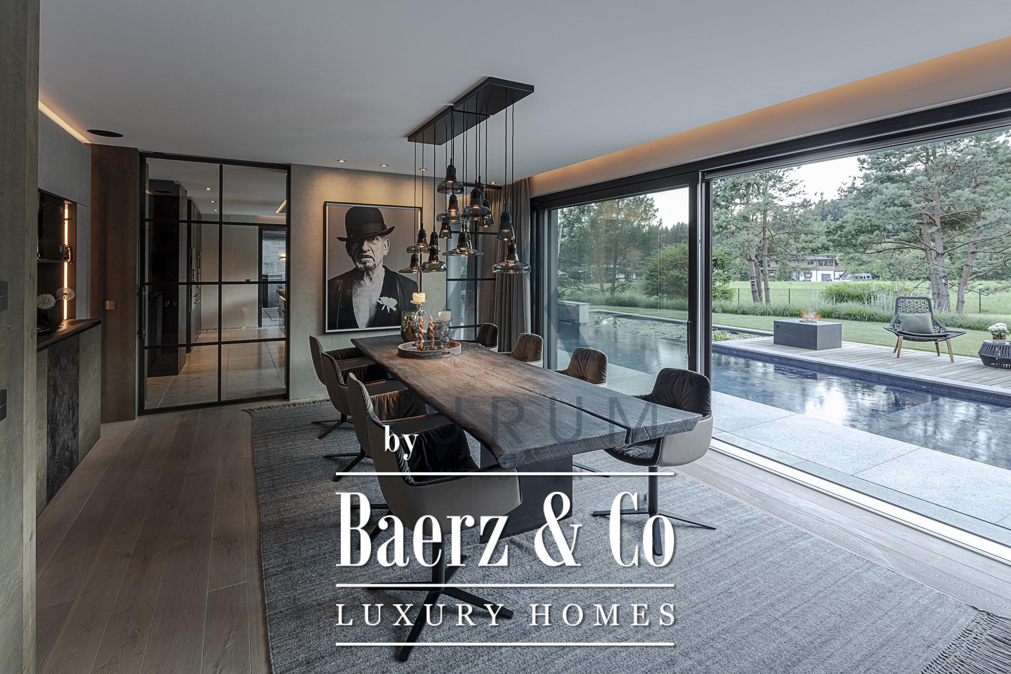 Technical mastery underlies the property’s sustainability and comfort. Geothermal energy, chilled ceilings, and a KNX-controlled ventilation system create a serene and energy-efficient interior. Every material—natural stone, bespoke carpentry, fine fixtures—is curated for timeless quality. The designer kitchen, fitted with Gaggenau appliances, sits at the heart of the home, while the master suite offers a private retreat with a luxurious bathroom and dressing room. Additional highlights include an advanced security system, multi-room SONOS sound, and parking for four vehicles.