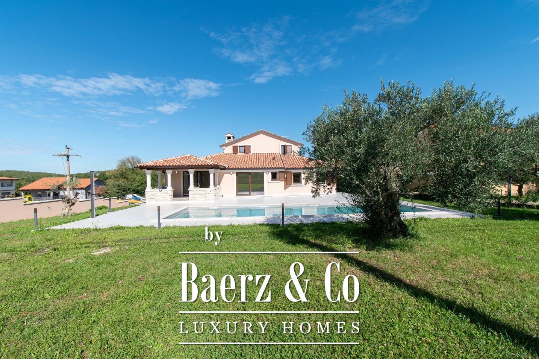 an oasis of peace.The quality of construction and equipment is at the highest level, with reinforced concrete construction and facade stone wool d=10 cm and a silicate finish, ensuring superior energy efficiency (certificate A). The ceiling height of 2.75 m gives a feeling of airiness, while high-quality joinery with triple glass in walnut color, plastered with bio-plaster of the interior and paint of the interior walls based on lime, create a healthy and pleasant environment. The floors are covered with ceramics from the Italian manufacturer NORDIK TILE and oak parquet of the 1st class.The villa is equipped with a fire protection system, DAIKIN heat pumps in all rooms with electronic regulation, and 11 air conditioners for optimal temperature throughout the year. Security is ensured by video surveillance, an intercom and an alarm system. The exterior impresses with five parking spaces (three covered), two entrances to the yard, and the facade of the house, terraces and stone-built (drywall) walls on an area of approximately 250-300 m2. Profiled stone erts on the windows, an outdoor shower, eight olive trees aged 60-70 years and external irrigation, round off this exclusive offer.If you want to own a quality, modern villa about 10 minutes from the first beaches in Vrsar or Poreč, feel free to contact us - we are at your disposal.