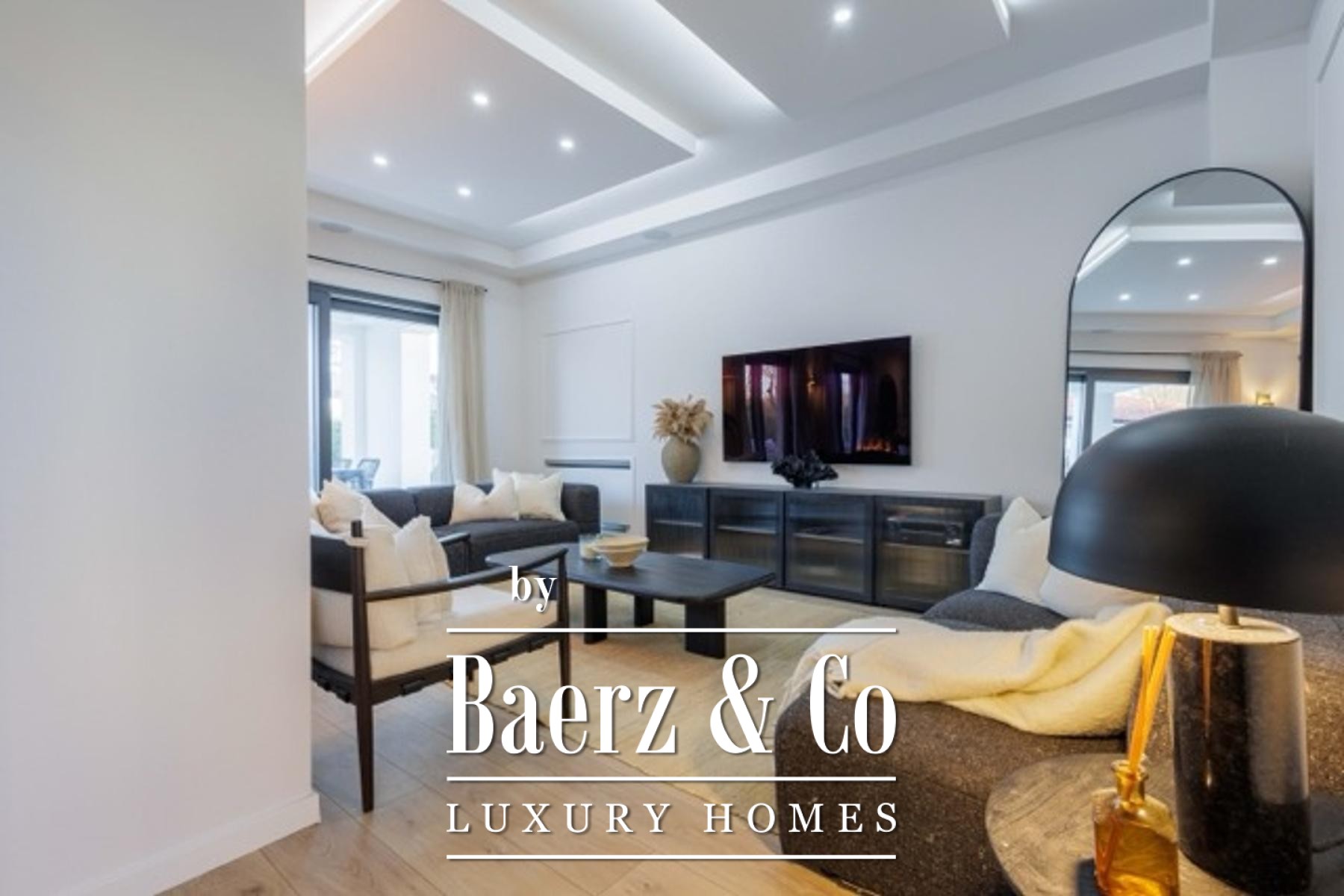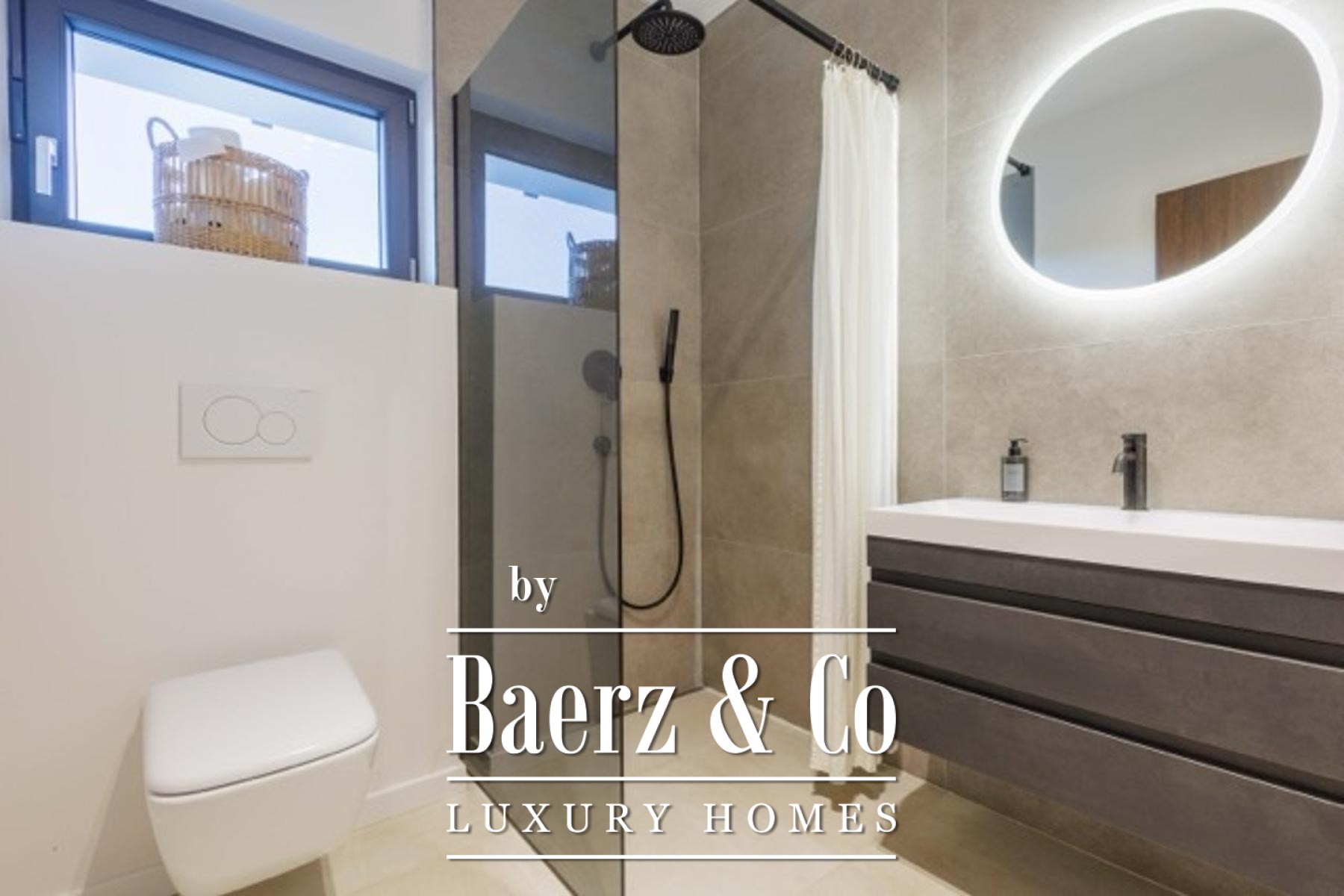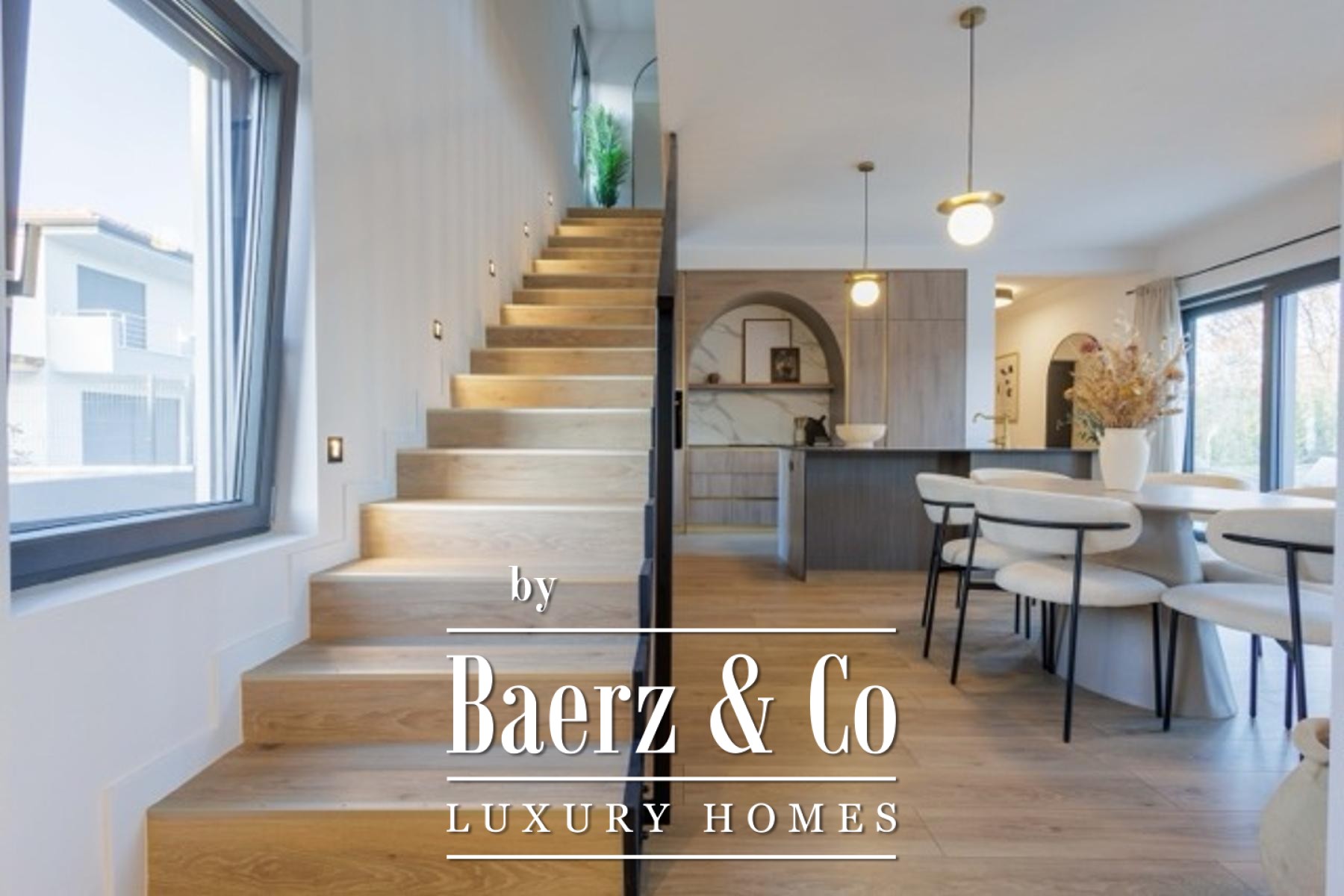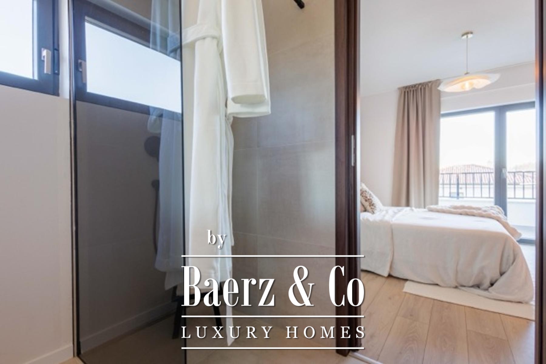 A carefully detailed staircase leads to three spacious bedrooms upstairs, all with en-suite bathrooms and access to a sun-drenched terrace overlooking the landscaped garden and a striking saltwater pool measuring 9 by 11 meters. Large windows showcase the surrounding natural beauty, offering a constant dialogue between interiors and the outside world. The courtyard provides ample parking, reinforcing practicality alongside luxury.