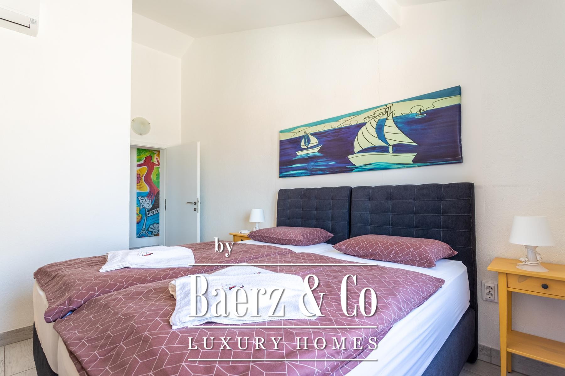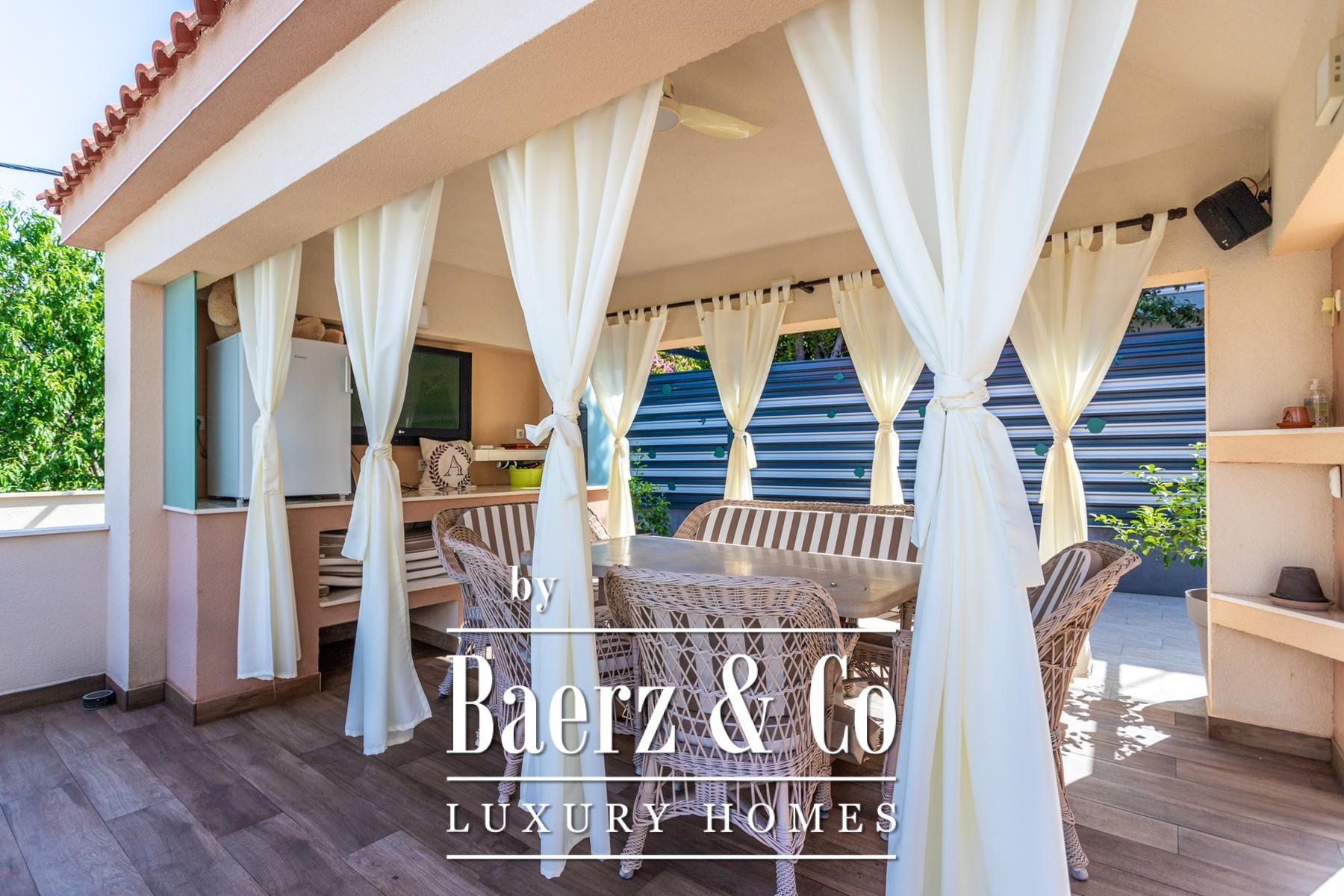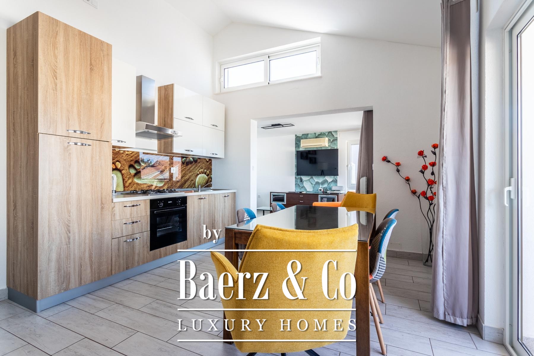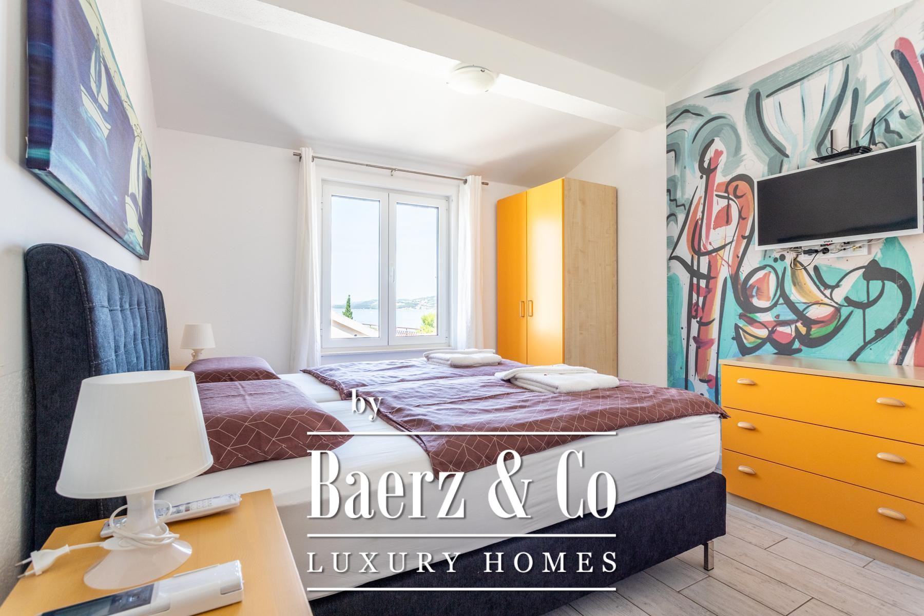Čiovo, Okrug Gornji, just eighty meters as the crow flies from the sea and the beautiful beach, is located this fully furnished house with a swimming pool. It is located on a plot of 500 m2, and has three comfortable residential units.The basement floor is arranged as a small storage room and fitness room.The ground floor is essentially a two-room apartment, consisting of a storage room, hallway, two bathrooms, two bedrooms, living room, hallway, kitchen with dining room and terrace.The