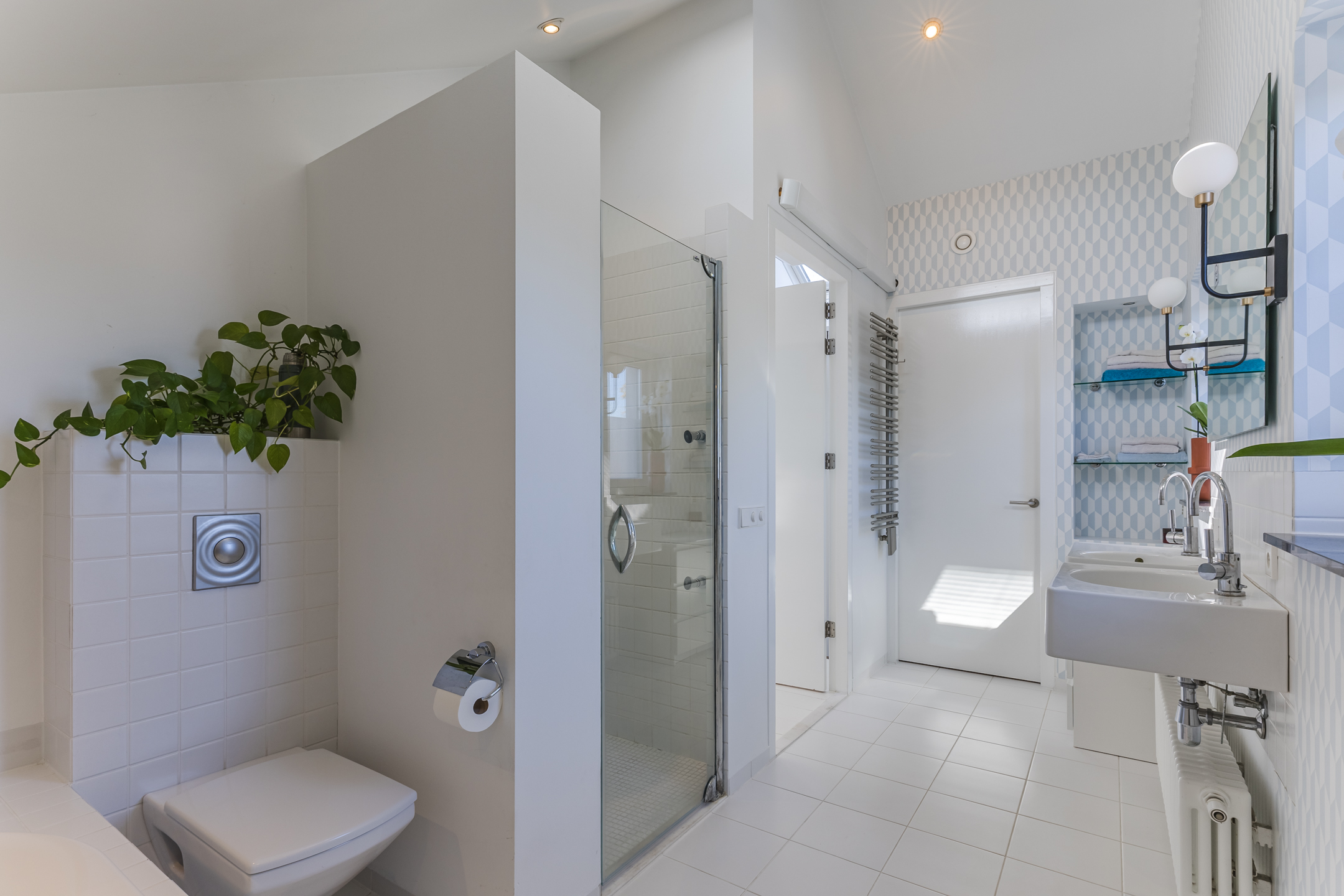 The spacious living area benefits from abundant natural light, underfloor heating, and a gas fireplace. The living room connects openly to the kitchen-diner but can be separated by elegant pivot doors. A practical cellar provides additional storage, and the unique raised room (opkamer) offers access to the first floor.