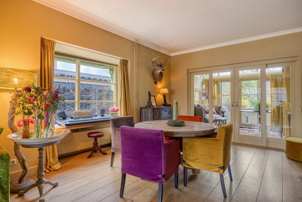You enter via the side of the house into the hallway, where the first 1920s details immediately reveal themselves: warm materials, lovely natural light, stained-glass windows and a pleasant flow towards the basement and living area. The toilet is modern and the staircase is authentic. The living room extends deep into the house and is wonderfully bright thanks to the large windows, bay window and the conservatory at the rear. The sense of warmth comes from the wooden floors, the elegant fireplace surround and the different seating areas that make the whole intimate and inviting. The conservatory is a delightful addition; here you can easily create a cosy seating area, with views of the garden through the French doors.