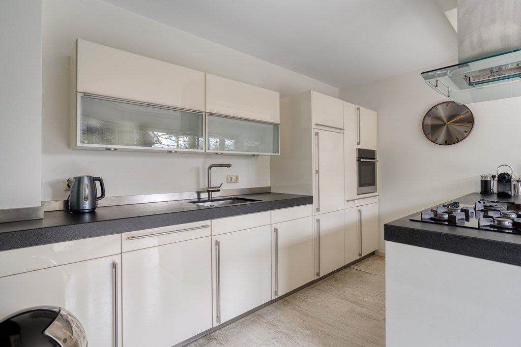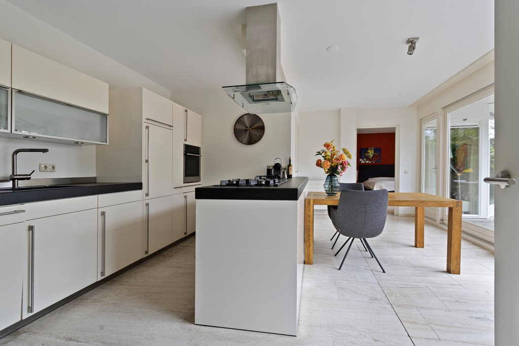 The spacious open-plan kitchen adjoins the living room. The kitchen is modern and generously designed, featuring an elongated kitchen island that invites social gatherings. It also includes a practical countertop along the wall and various built-in appliances, such as a gas stove with extractor hood, a sink, and a dishwasher. Additionally, you will find a built-in oven combination, a refrigerator, and ample storage space. This kitchen perfectly combines functionality with style and comfort.