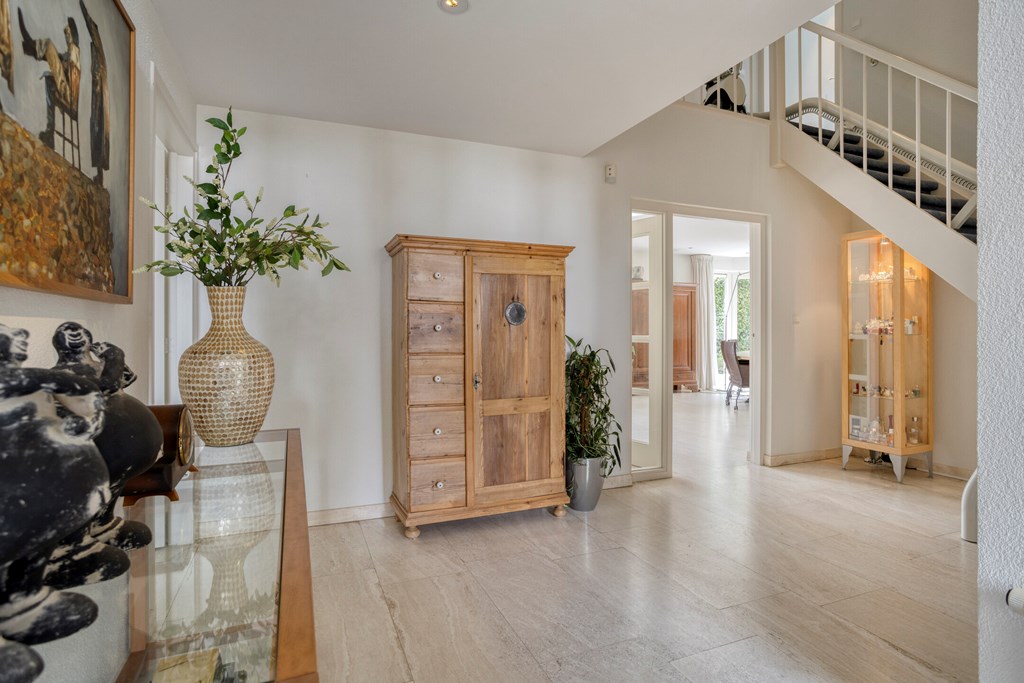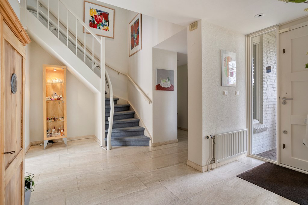You enter the property from the street side, where you have your own driveway, including a carport. There is also ample parking available in the immediate area. Once inside, you arrive in a spacious and well-maintained hallway that immediately offers a warm welcome. From here, you have access to the toilet, the study, the living room, and the staircase to the first floor. The hallway serves as a central and practical hub within the home.