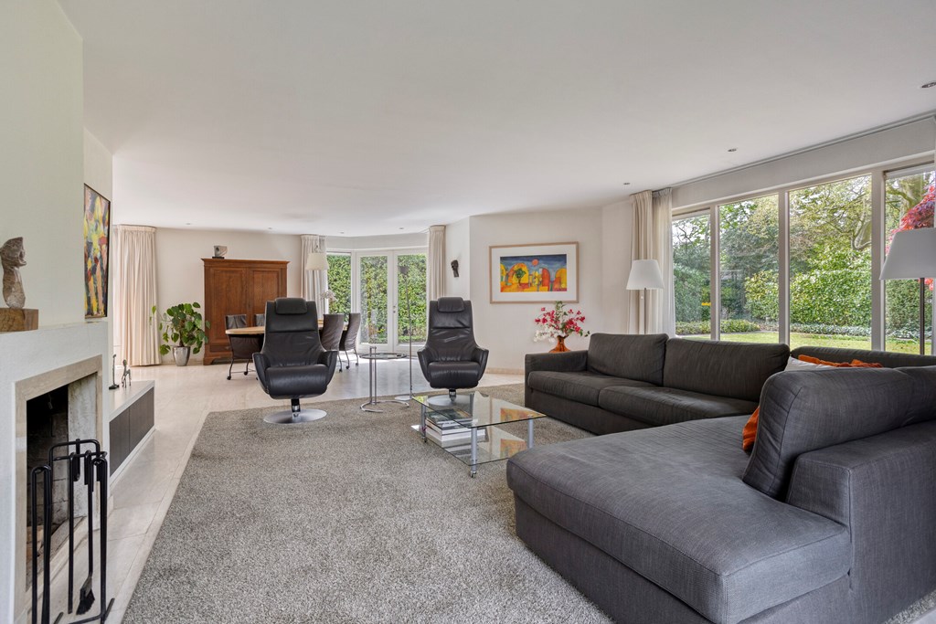 The living room is undoubtedly the beating heart of the ground floor. This generously sized space is characterized by its open layout and abundance of natural light. There is plenty of room to create a comfortable seating area and a cozy dining space. The fireplace serves as a true eye-catcher, adding warmth and atmosphere. Through the French doors, the living room is directly connected to the garden, seamlessly blending indoor and outdoor living.