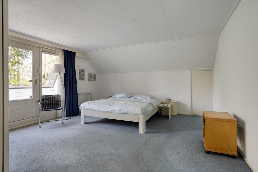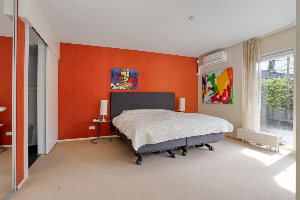 On the ground floor, there is a spacious and well-maintained bedroom. The room is bright and offers sufficient space for a bed, desk, and wardrobe. Thanks to the air conditioning, you can enjoy extra comfort here. The room also provides direct access to the garden, making it particularly appealing.