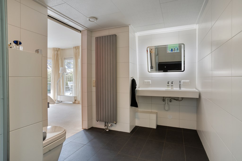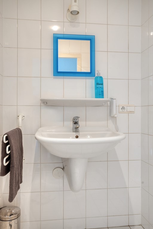 Adjacent to the bedroom, you will find a fully tiled bathroom. It is equipped with a wall-mounted toilet, a walk-in shower, and a washbasin with mirror, offering all conveniences on the ground floor.