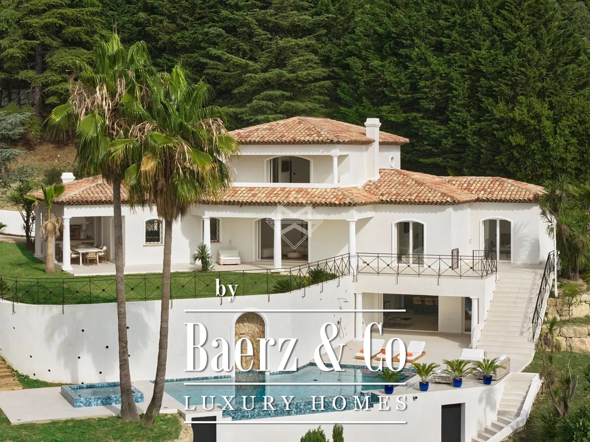 The garden level hosts an independent 73 m² apartment with two bedrooms, a bathroom, living room, and open kitchen, all opening onto a terrace beside the infinity pool, perfect for privacy or gatherings. The estate’s 4,700 m² of landscaped grounds, approached via a driveway lined with olive trees, offer an infinity pool, jacuzzi, double garage, and ample parking. Thoughtful amenities such as air conditioning, double glazing, security systems, and outdoor lighting ensure refined comfort throughout. Ten minutes from the center of Vence, twenty-five minutes from Nice airport, and twenty minutes from the coast, this villa offers a rare synthesis of Mediterranean serenity and cosmopolitan access.