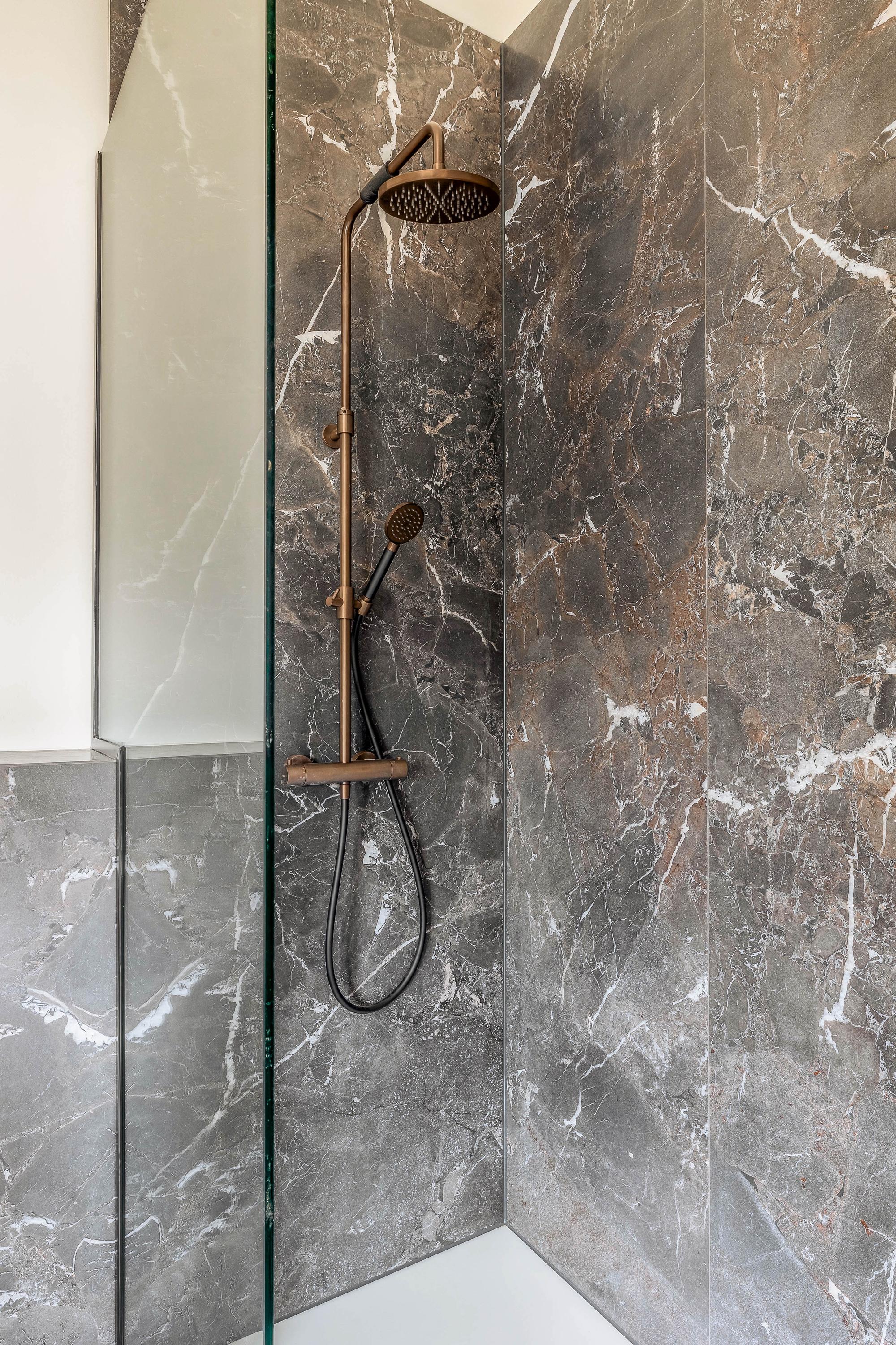 • A luxury bathroom with modern finishes and high-quality materials, including a walk-in shower and stylish sanitary fittings.