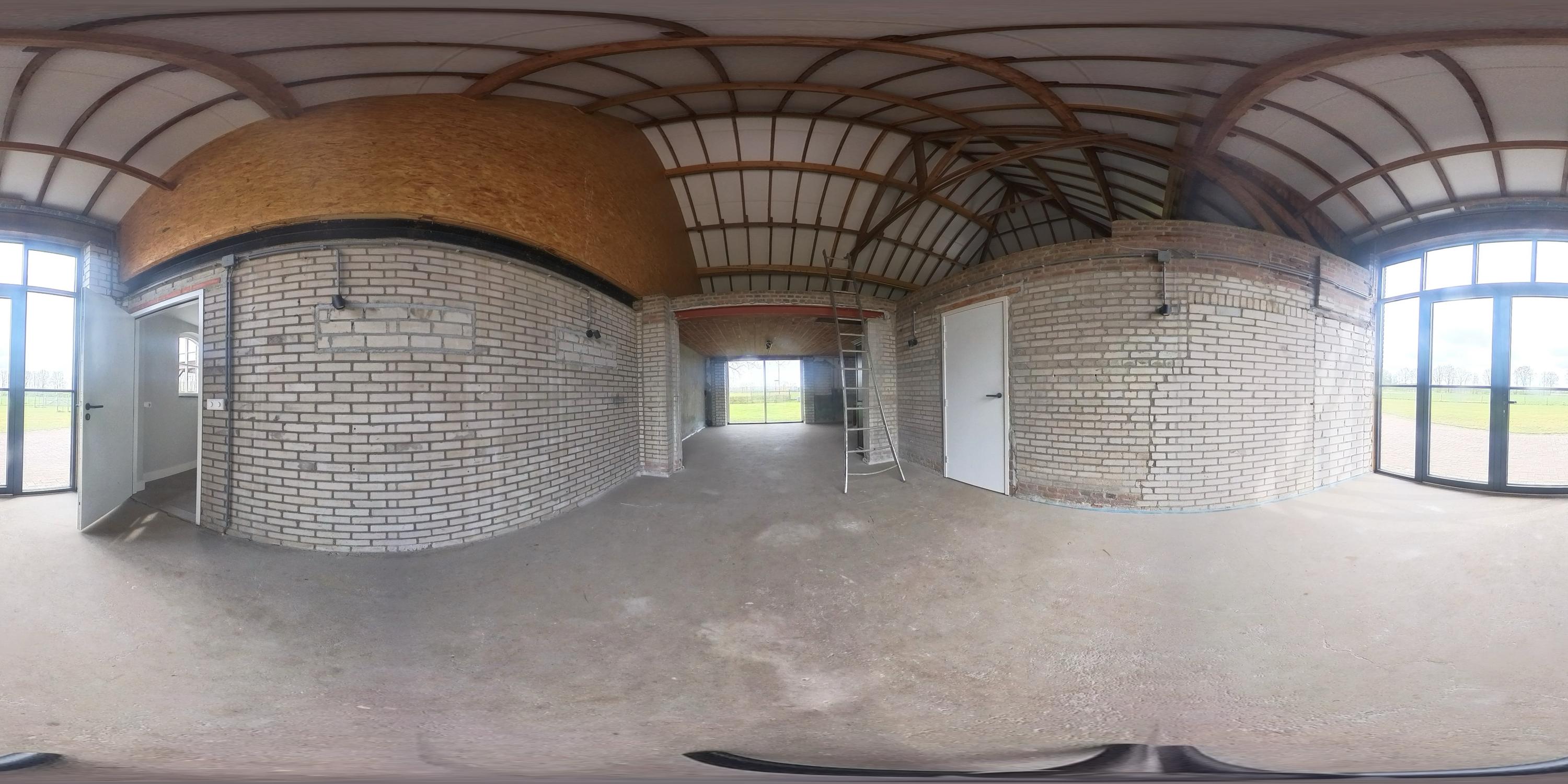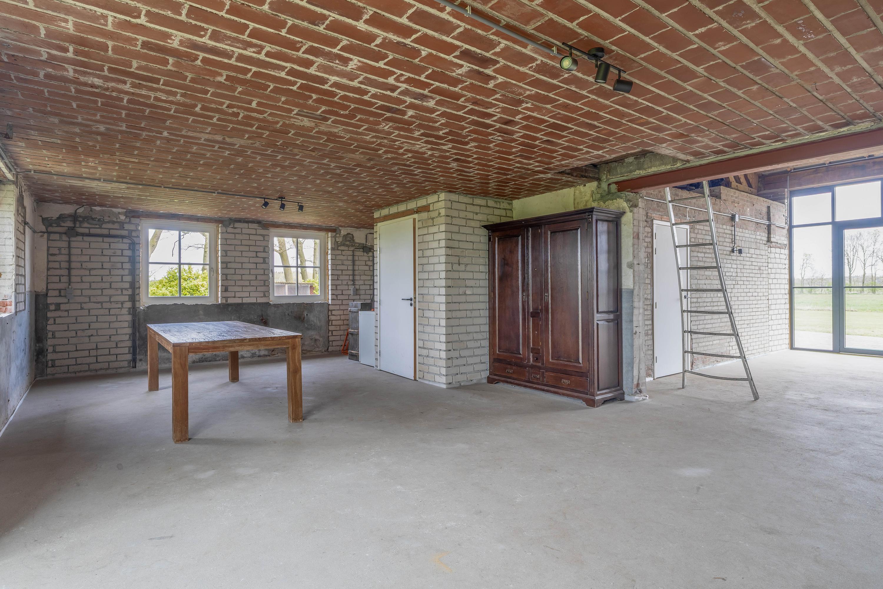 Adjacent to this is the indoor rear annex which, alongside the indoor garage, offers a considerable amount of additional usable space. This forms a solid foundation and was designed with versatility in mind. The rear annex is therefore ideally suited to a variety of uses, such as independent living accommodation (informal care), an office or practice space with meeting facilities, or a comfortable guest house. The space features a refurbished concrete floor with underfloor heating, brick walls and exposed wooden beams that enhance the rustic atmosphere. Part of the space has a mezzanine, and there is plenty of natural light. French doors in the rear façade provide a direct connection to the garden. There is also a separate toilet with a wall-hung toilet and washbasin. The rear annex also provides access to the built-in garage. The garage is accessible from the courtyard via a wide entrance door.