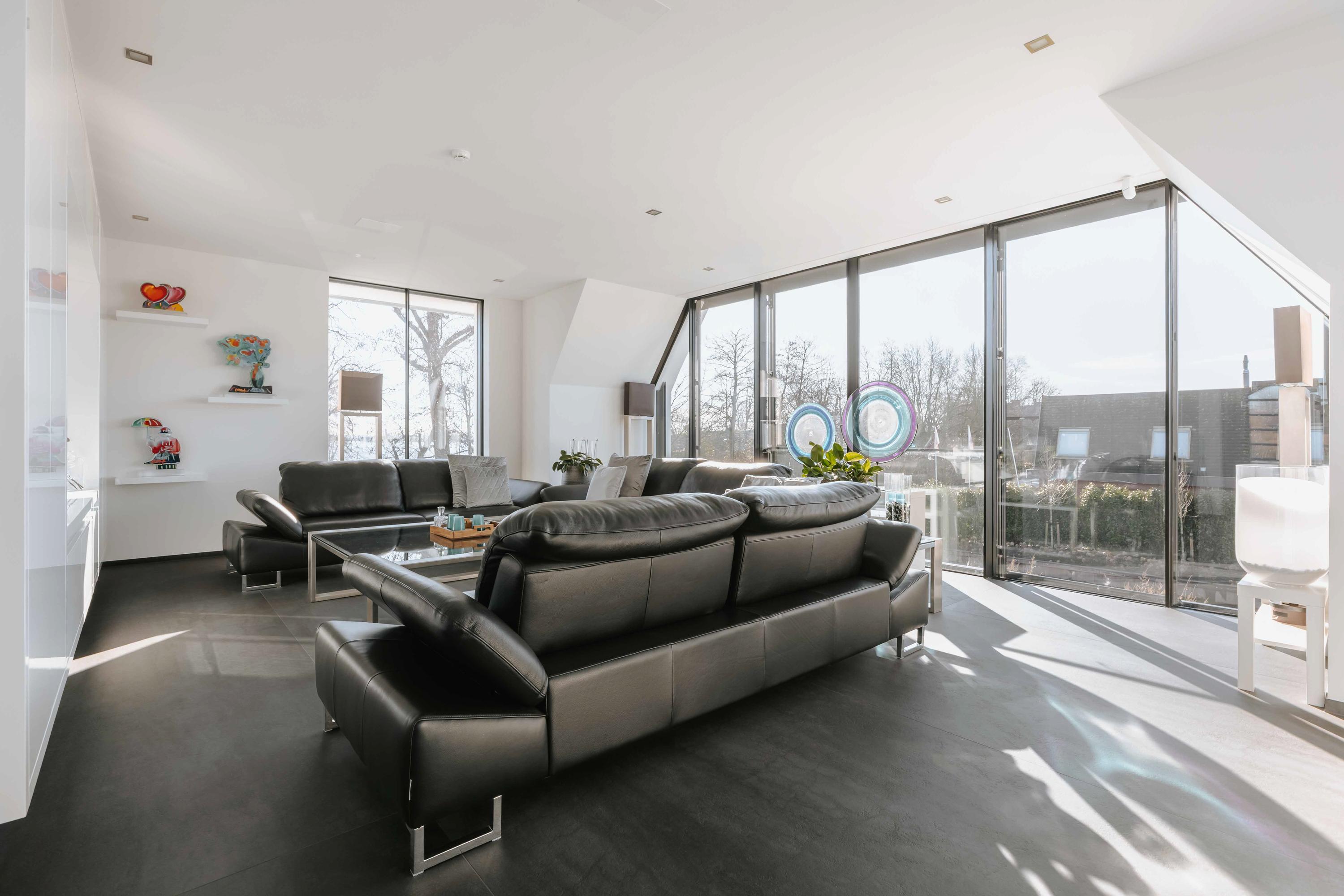 The second floor features three comfortable bedrooms and two luxurious bathrooms. The impressive master suite has a walk-in closet, air conditioning, and a fully equipped wellness bathroom with a sun shower, steam shower, and bathtub. All rooms have been finished with an eye for detail and feature custom cabinets and luxurious sanitary ware.