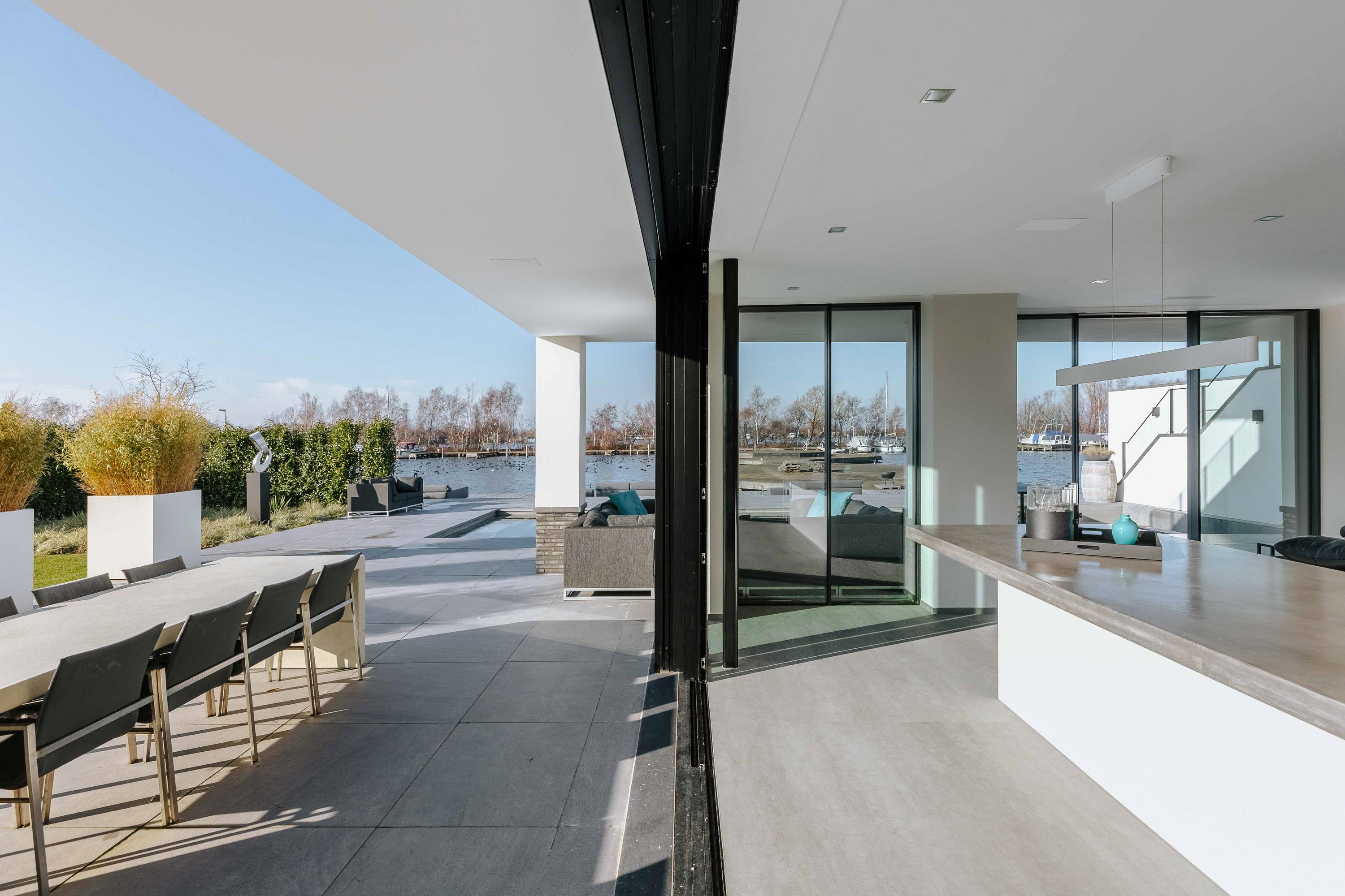 The villa is spread over several levels and has a passenger lift that can reach all levels. The spacious living area is located on the first floor and is characterized by impressive light thanks to floor-to-ceiling windows all around. Inside and outside flow seamlessly into each other here. The luxurious designer kitchen (Lodder) with high-quality built-in appliances forms the heart of the floor, flanked by a spacious dining room and living room with gas fireplaces and stylish, silently sliding steel/glass doors. From the kitchen, you can enjoy phenomenal views of both the harbor and the Vinkeveense Plassen lakes.
