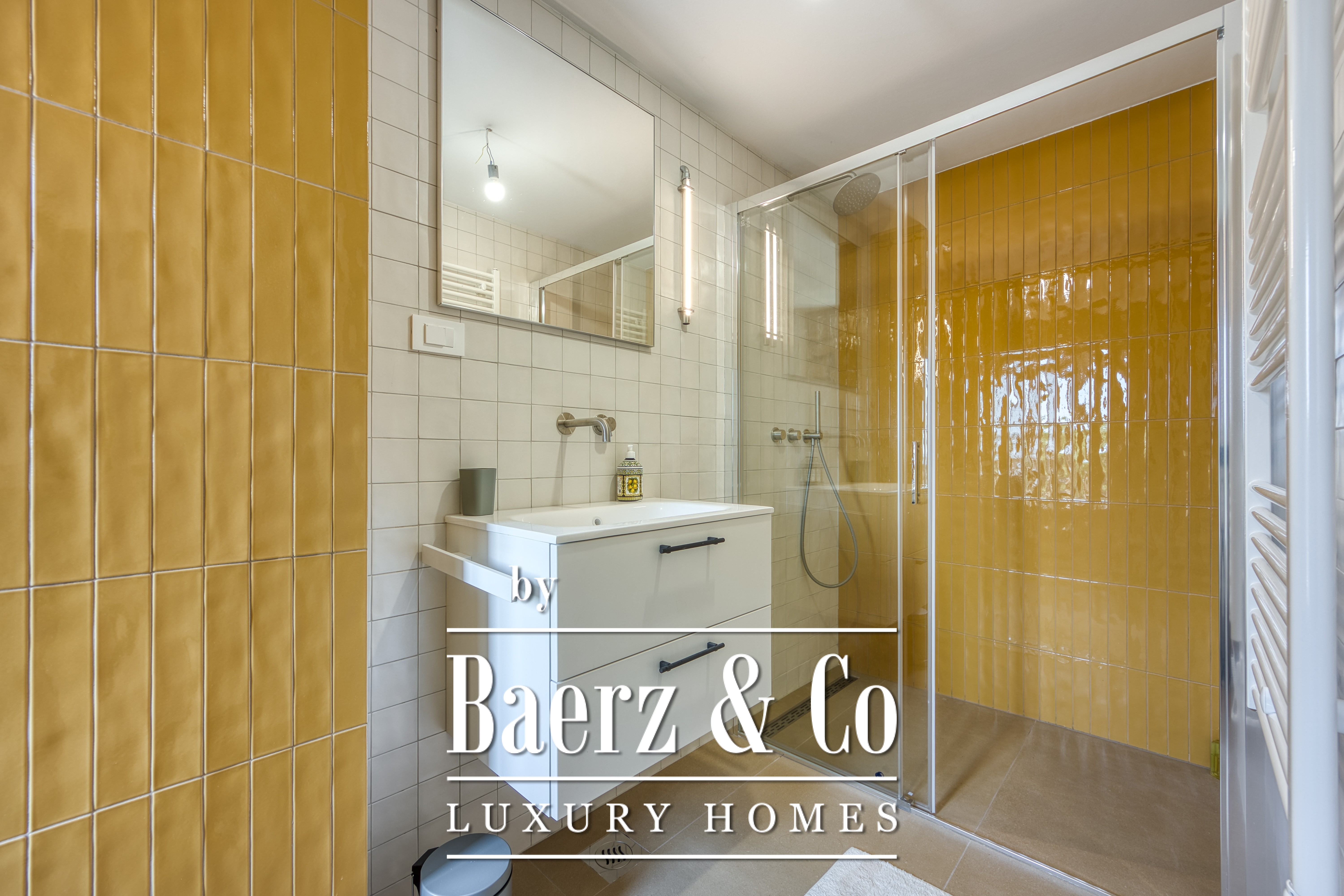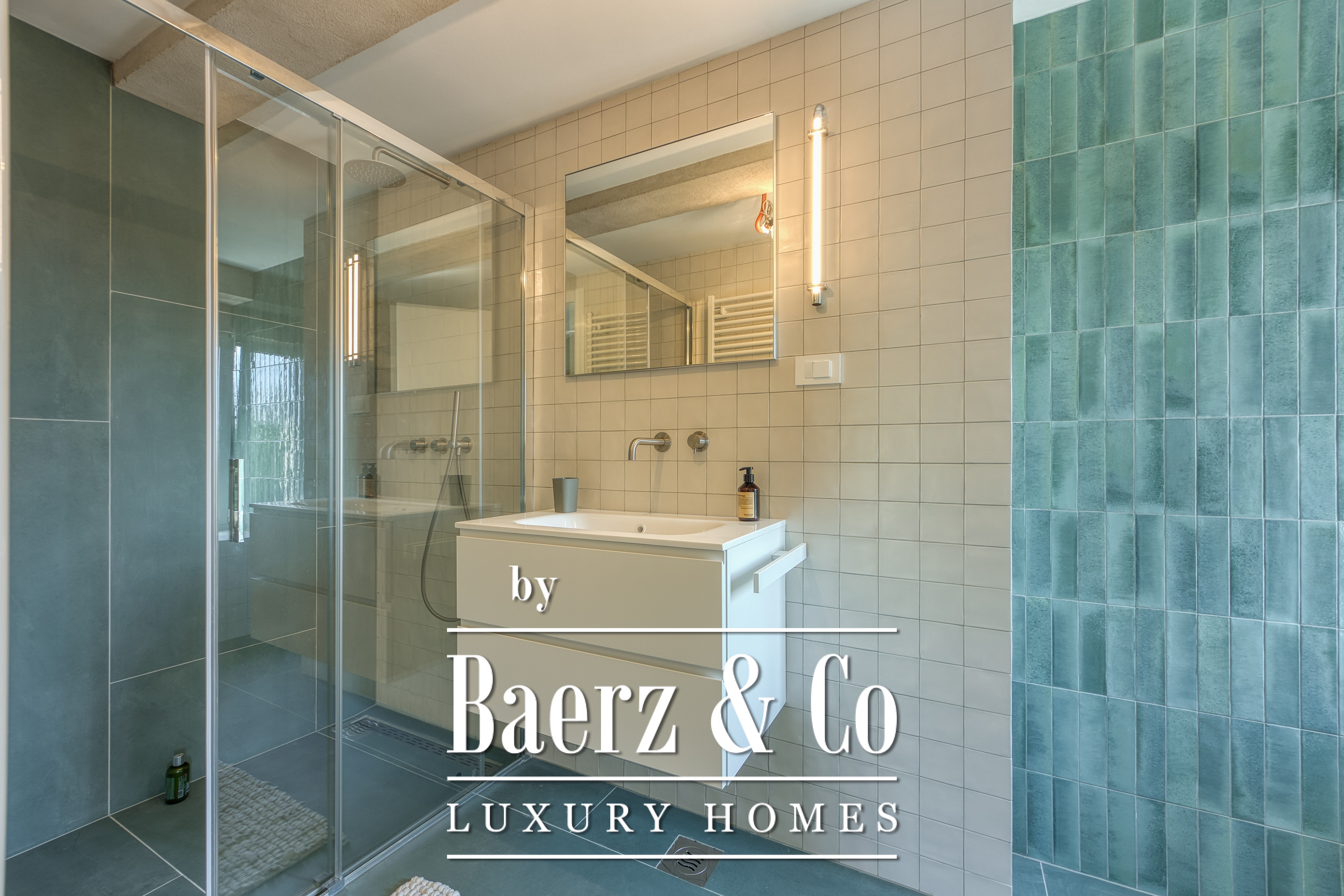On the upper floor, there are three spacious bedrooms, each with its own bathroom, offering privacy and maximum comfort. A fourth bedroom with a bathroom is located on the ground floor, providing additional flexibility. The house is oriented to the east and south, allowing plenty of natural sunlight. Underfloor heating, air conditioning, and a 15 kW solar power system ensure a pleasant living environment in all seasons, while the house is perfectly suited for year-round residential use.
