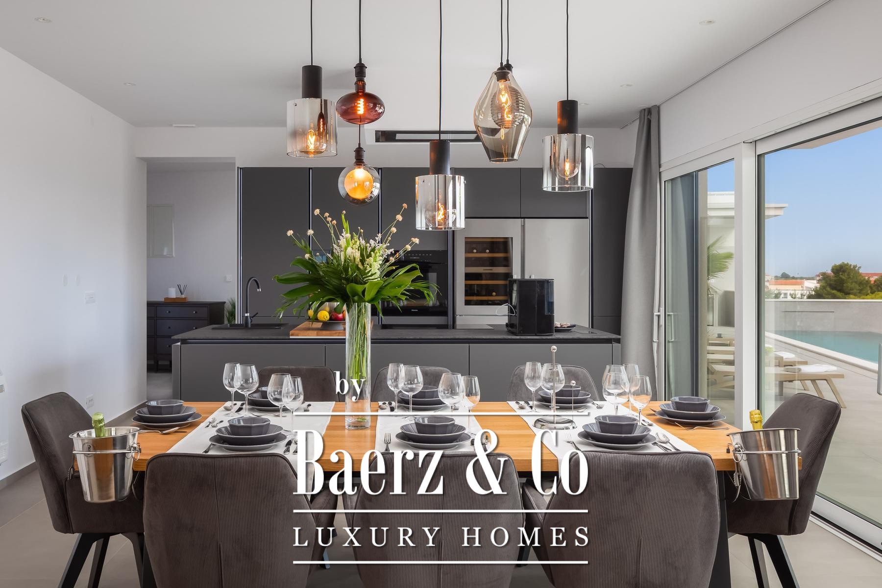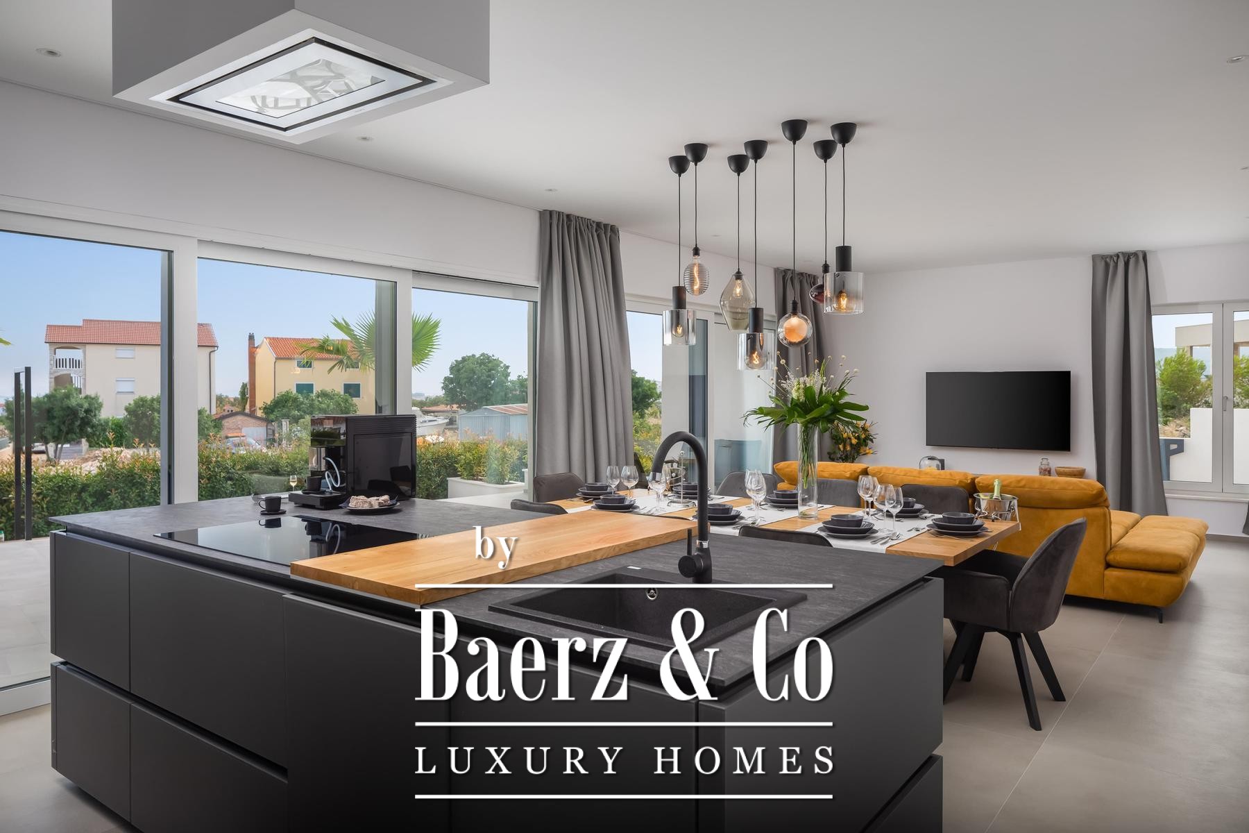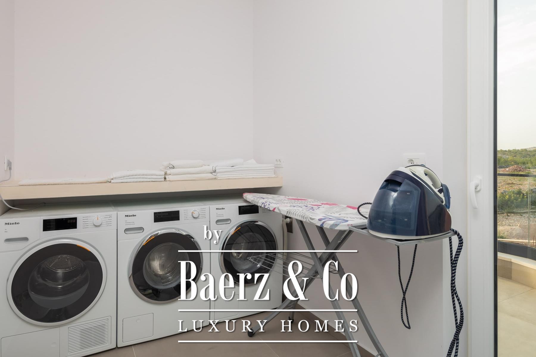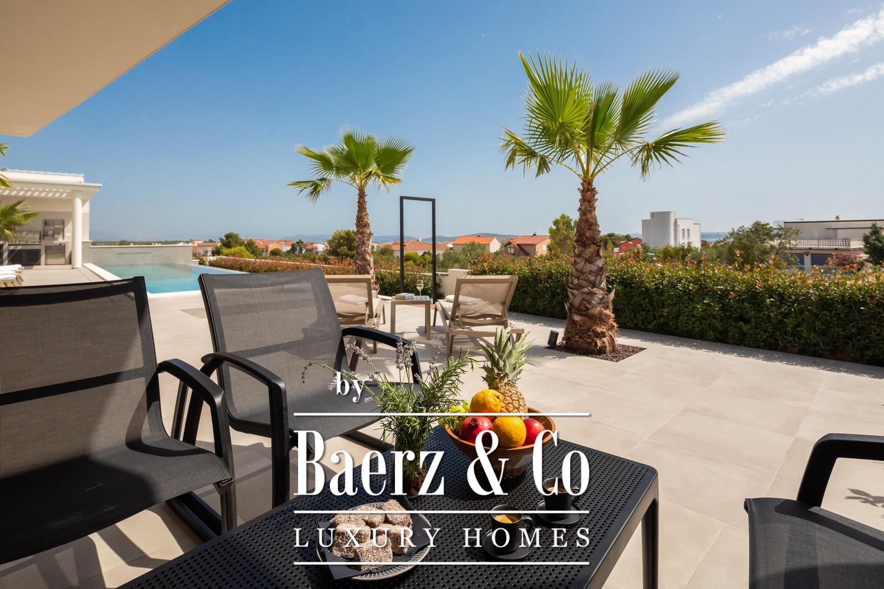 a terrace with a sea view.The villa is superbly equipped, and we would like to highlight the following: underfloor heating connected to a heat pump, an electric car charger in the garage, aluminum joinery, Miele kitchen appliances, central vacuum cleaner, saltwater pool with counter-current swimming system, smart remote home control system, summer kitchen with professional appliances, preparation for solar panels on the roof, electric bicycles...A beautiful garden and sunbathing area surrounds the villa. In addition to the garage, the villa has parking for 3 cars. The microlocation of the villa is excellent, in a very quiet place, yet only 900 meters from the sea.All other information on request.