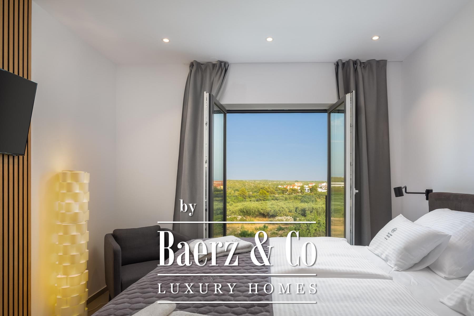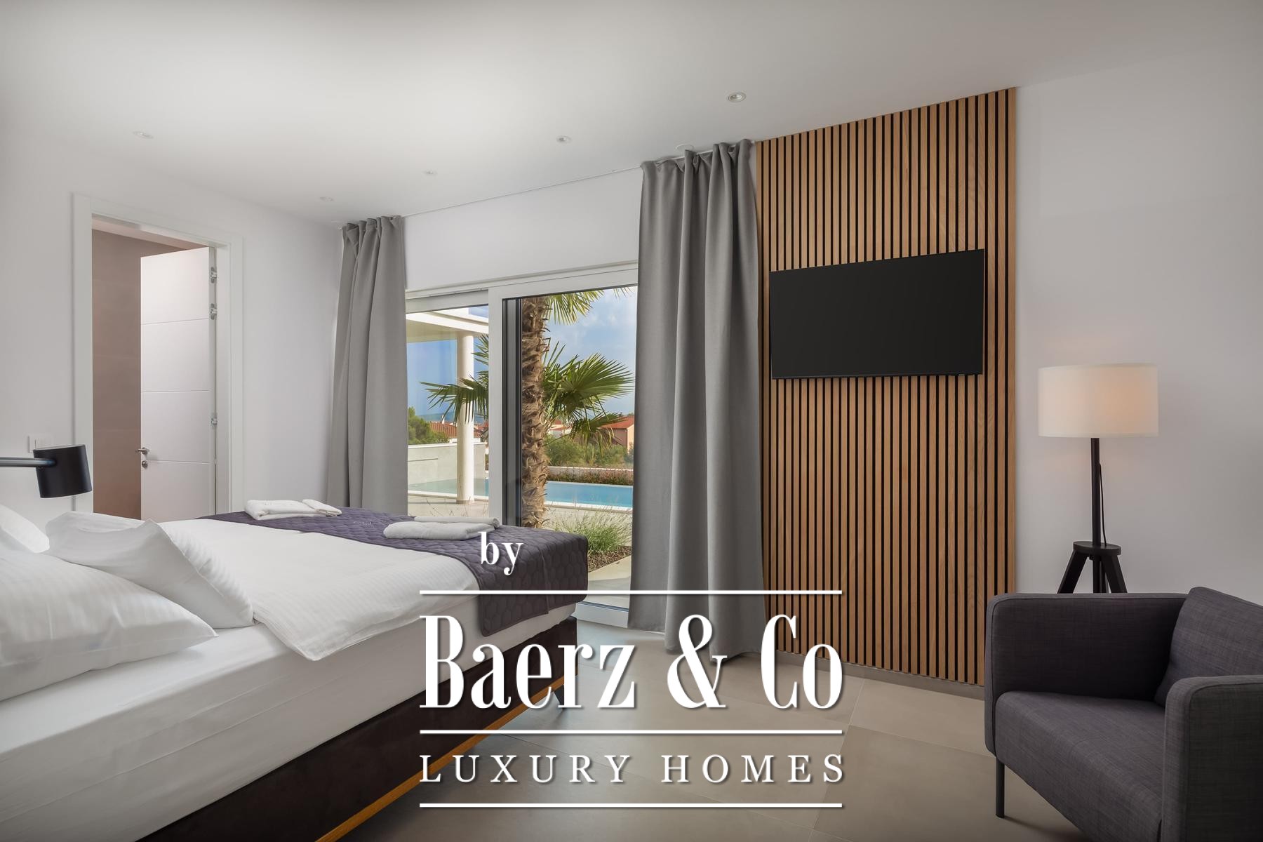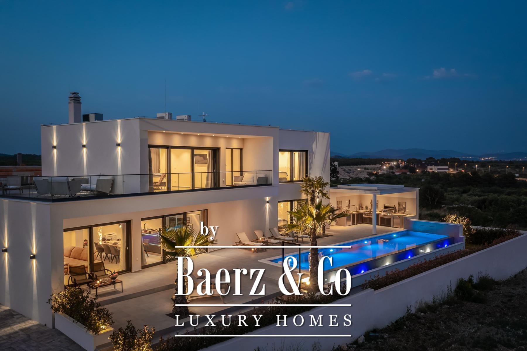 a terrace with a sea view.The villa is superbly equipped, and we would like to highlight the following: underfloor heating connected to a heat pump, an electric car charger in the garage, aluminum joinery, Miele kitchen appliances, central vacuum cleaner, saltwater pool with counter-current swimming system, smart remote home control system, summer kitchen with professional appliances, preparation for solar panels on the roof, electric bicycles...A beautiful garden and sunbathing area surrounds the villa. In addition to the garage, the villa has parking for 3 cars. The microlocation of the villa is excellent, in a very quiet place, yet only 900 meters from the sea.All other information on request.