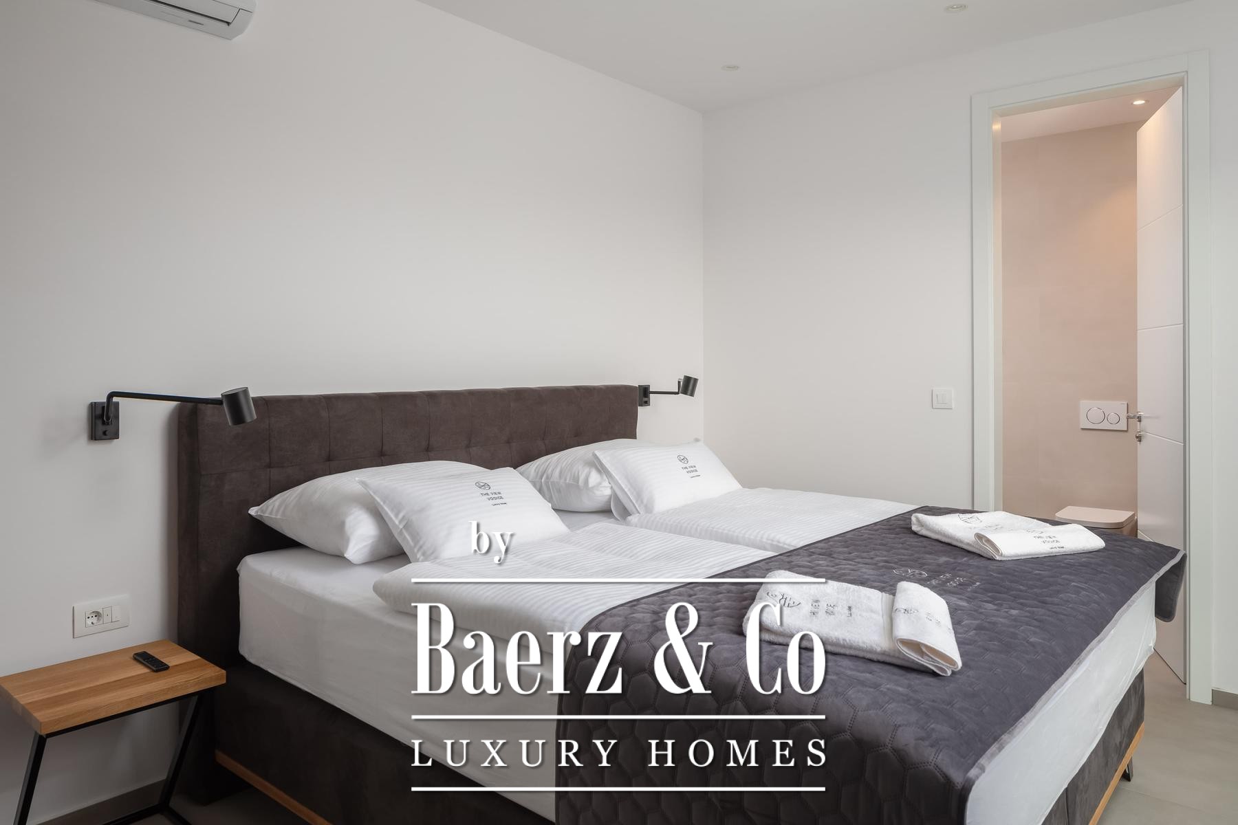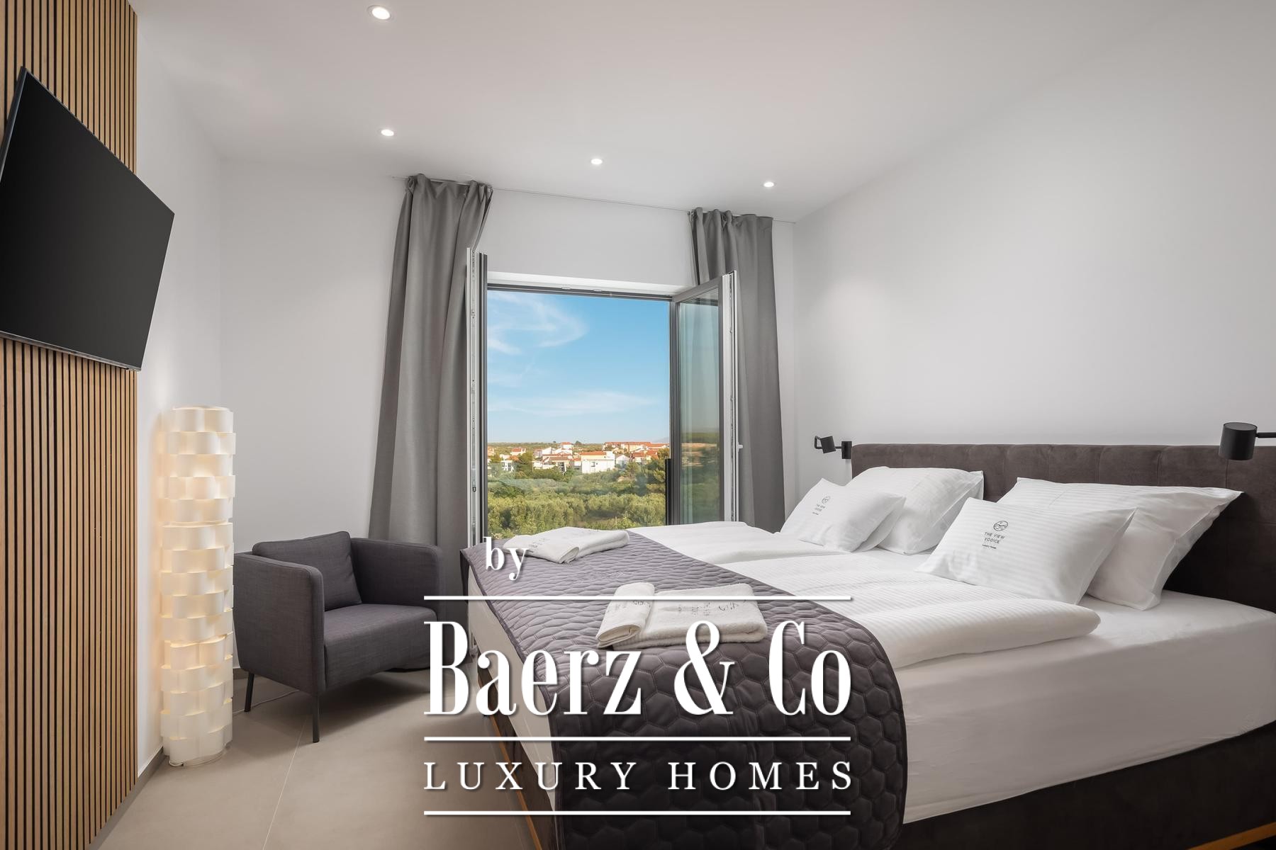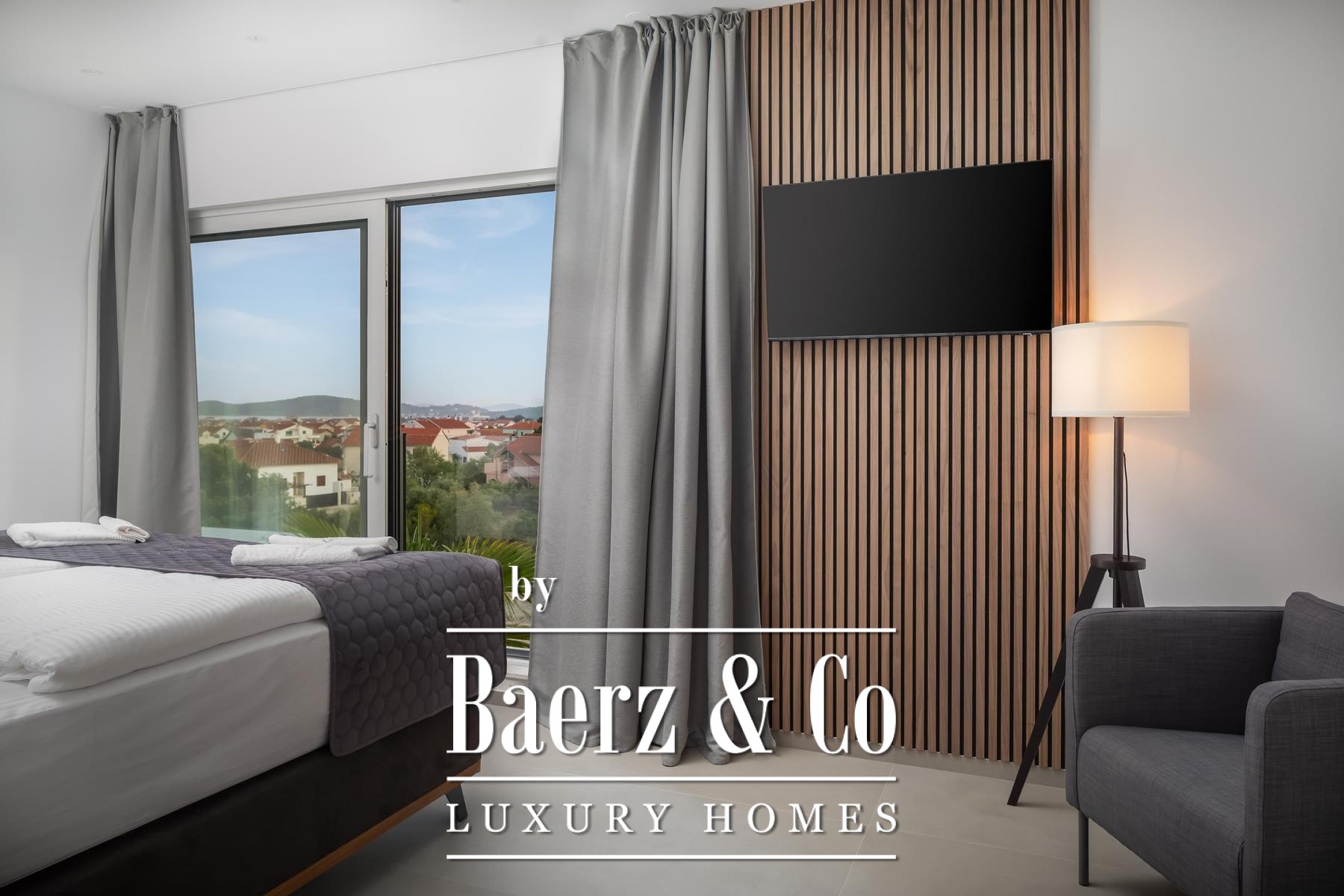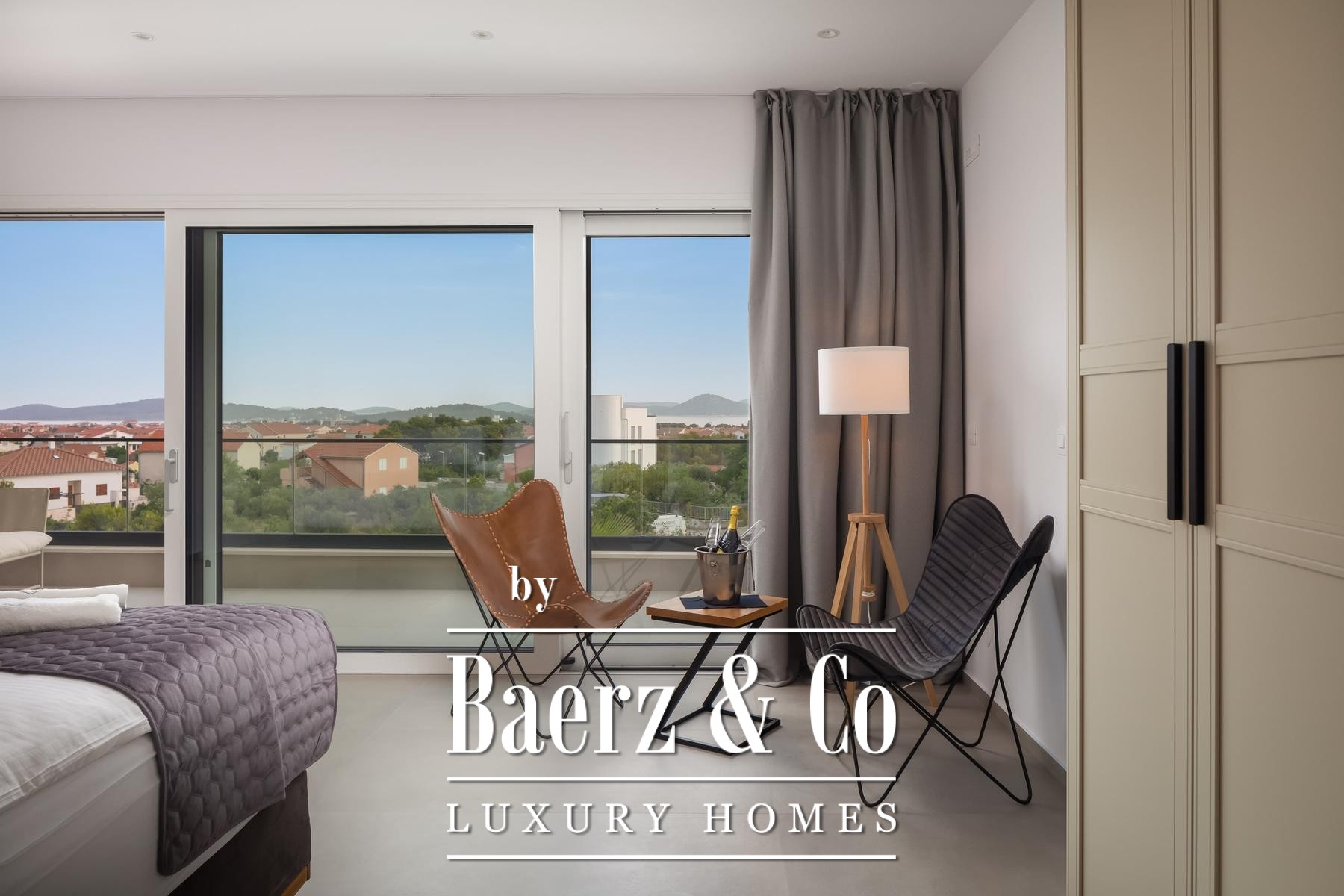 a terrace with a sea view.The villa is superbly equipped, and we would like to highlight the following: underfloor heating connected to a heat pump, an electric car charger in the garage, aluminum joinery, Miele kitchen appliances, central vacuum cleaner, saltwater pool with counter-current swimming system, smart remote home control system, summer kitchen with professional appliances, preparation for solar panels on the roof, electric bicycles...A beautiful garden and sunbathing area surrounds the villa. In addition to the garage, the villa has parking for 3 cars. The microlocation of the villa is excellent, in a very quiet place, yet only 900 meters from the sea.All other information on request.