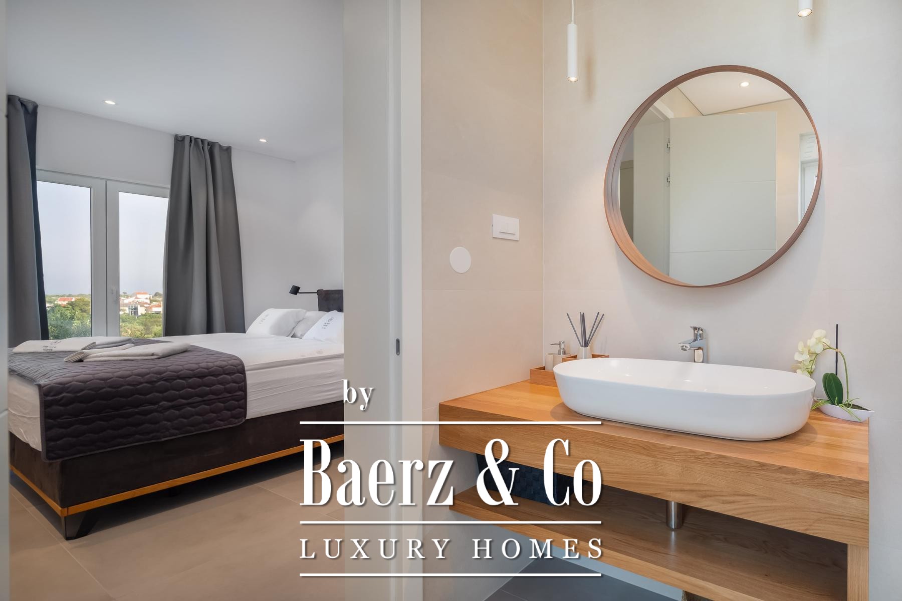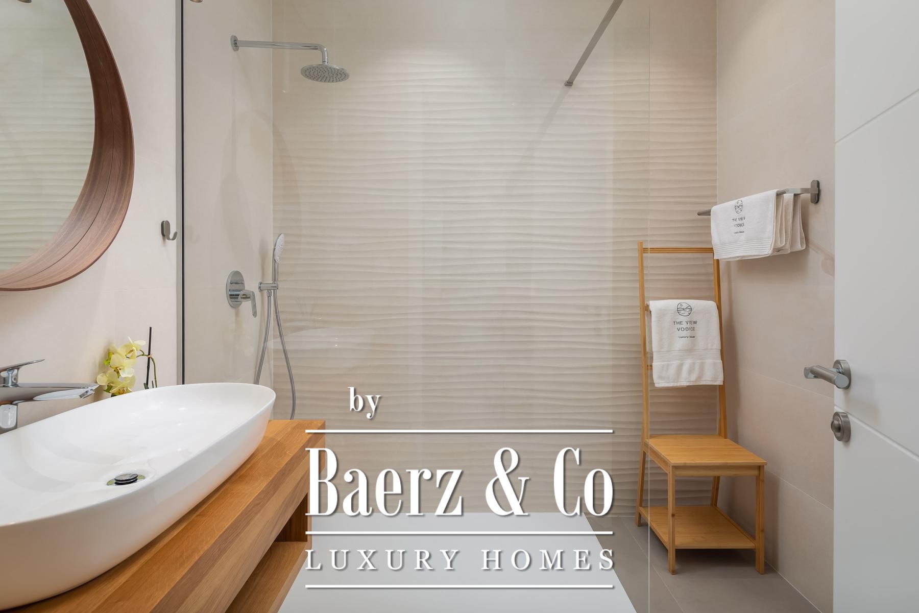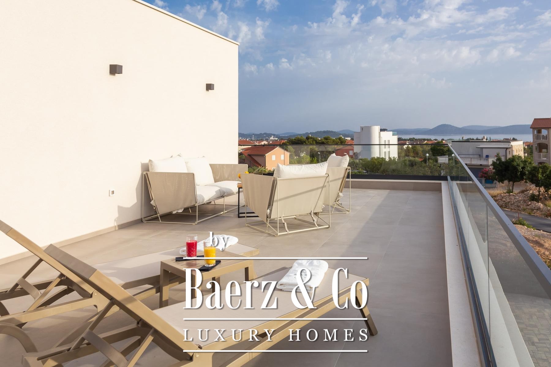 Vodice, modern villa with a swimming pool and sea view, 332.92 m2. The villa was built in 2022. It is being sold fully furnished and equipped, and is ideal for a vacation or tourist rental.Built on 2 floors on a plot of 838 m2. It consists of a ground floor with 2 bedrooms, each with its own bathroom, a garage, a toilet, and a spacious living room with a kitchen and dining room. The living room opens onto an outdoor terrace with a large heated pool next to which there is a sunbathing area, and a summer kitchen equipped with top-quality appliances. On the first floor there are three more bedrooms, each with its own bathroom, and a laundry room with a washing machine and two dryers. The bedrooms open onto