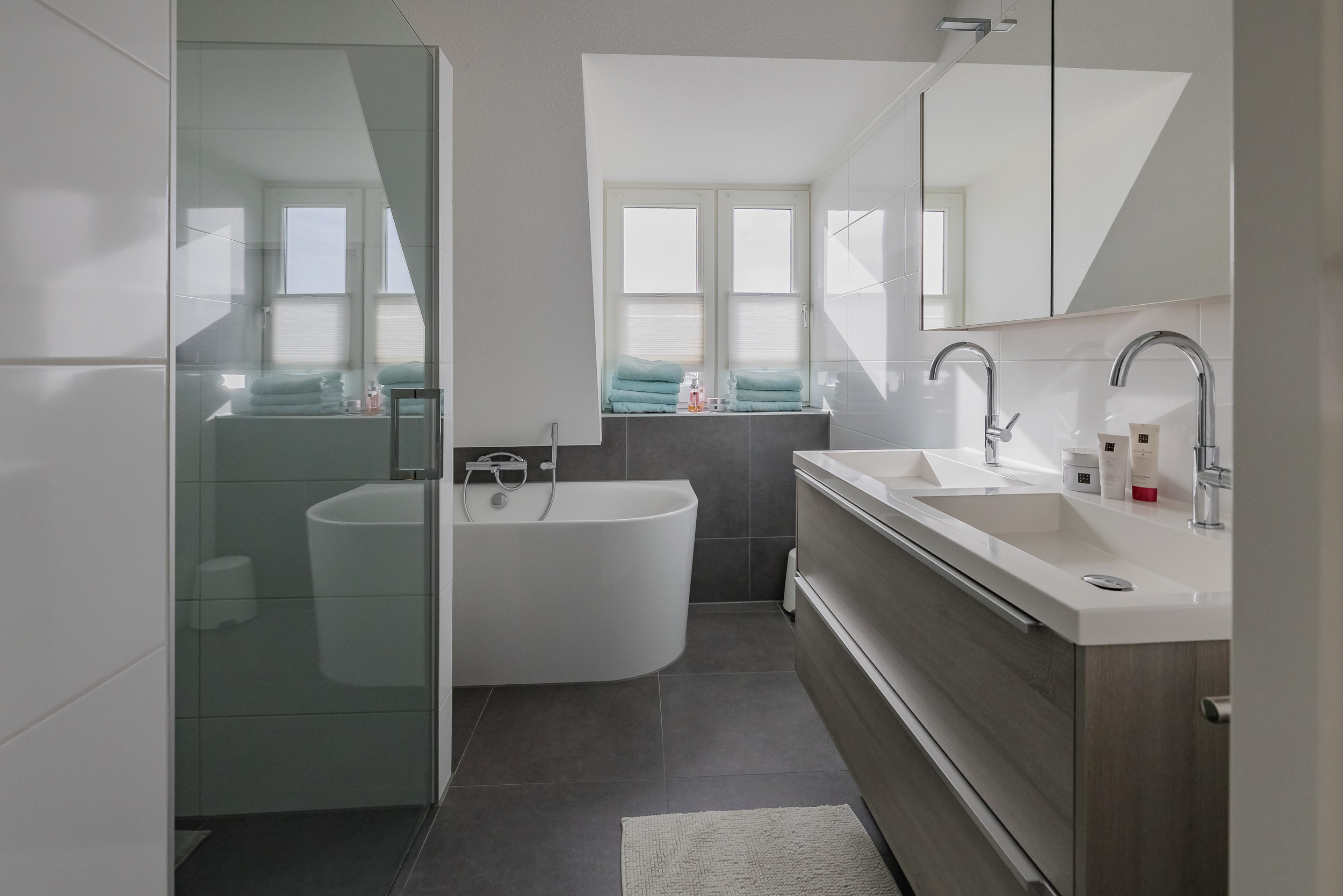 • A luxurious bathroom with a bathtub, walk-in shower, and double sink