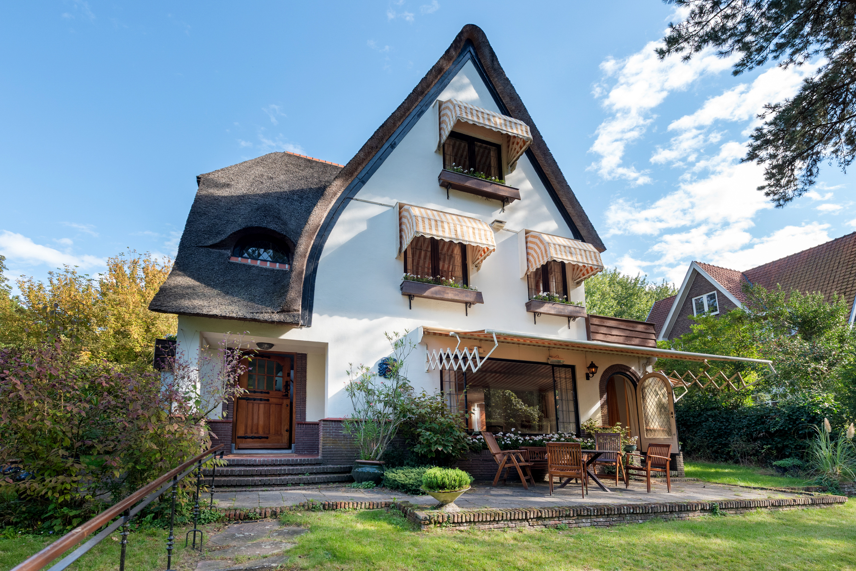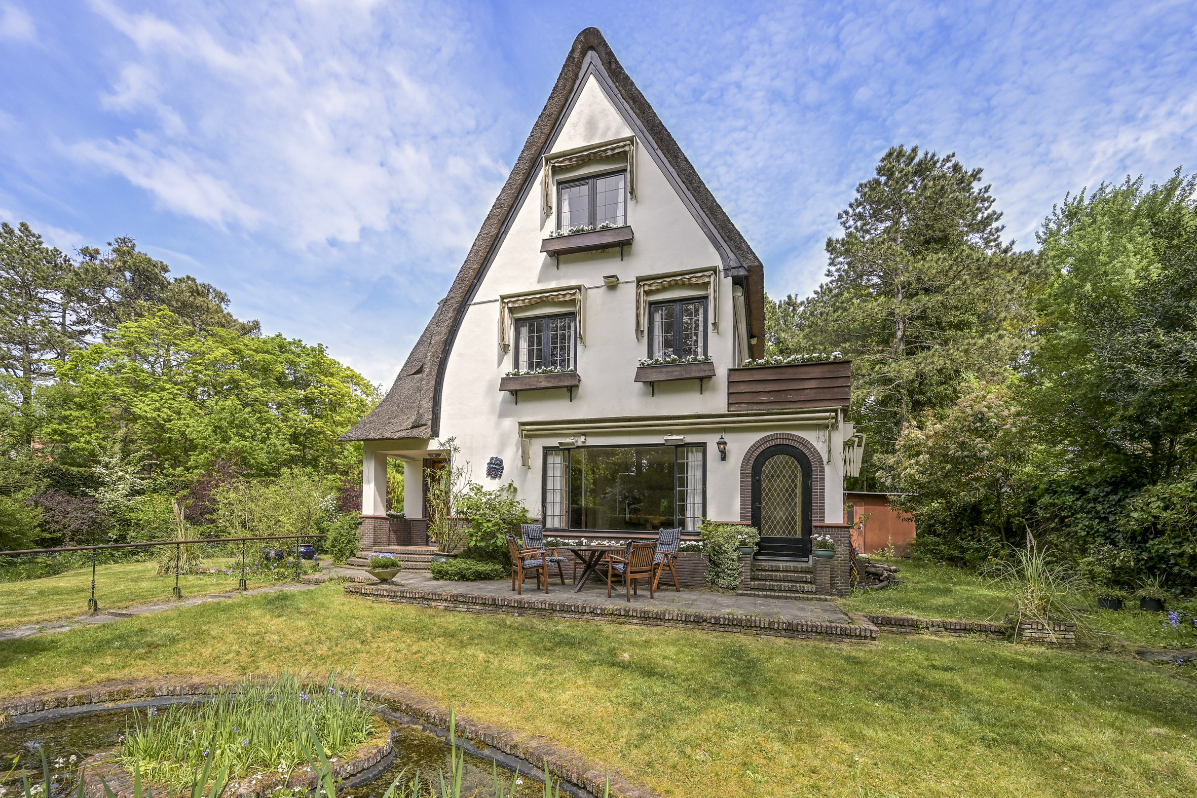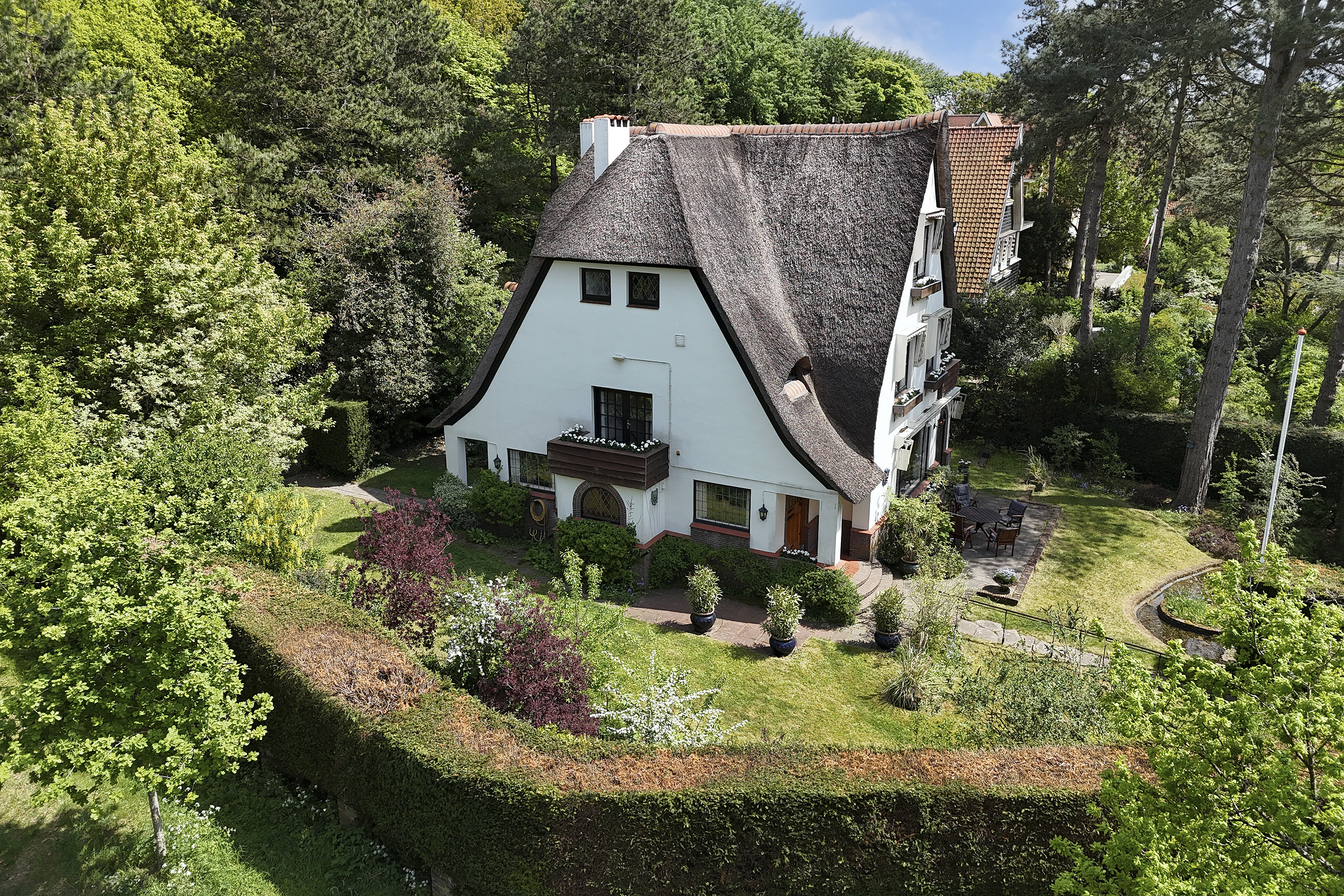 Detached villa Wassenaar offers a light-filled and charming residence, distinguished by its thatched roof and beautifully landscaped, sunny plot of 1000 m². The villa provides approximately 237 m² of refined living space, blending understated style with palpable warmth. Signature oak accents—seen in the solid front door, stair finishes, and parquet flooring—underscore a thoughtful attention to authentic materials and timeless design.