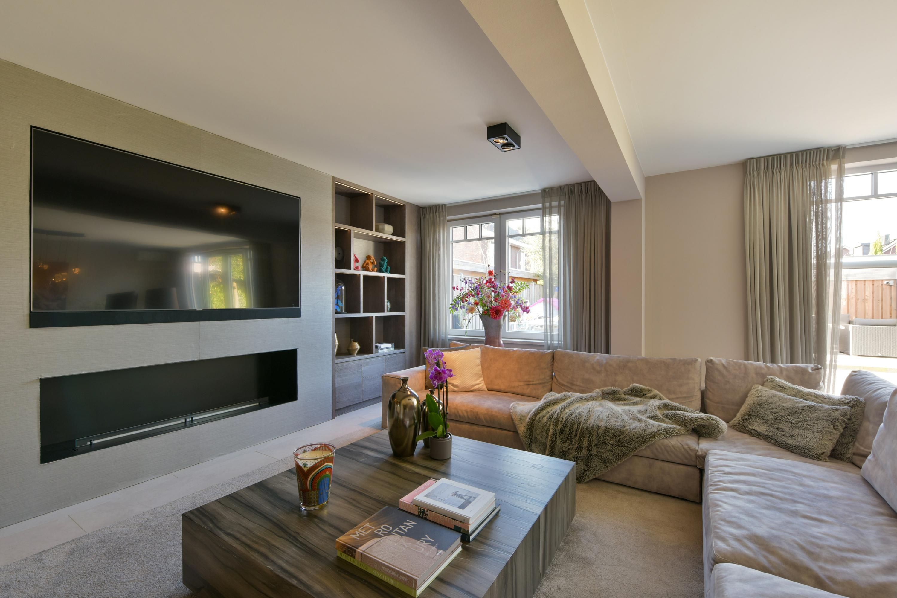 Opening this door reveals an impressively spacious and bright living room. Thanks to the extension at the rear—without a supporting column—the space feels completely open and uninterrupted. The custom-designed wall unit facing the garden perfectly combines design and functionality, with open shelves, concealed storage, a dedicated space for the TV, and a cozy bio-ethanol fireplace. All designed by Eric Kuster, whose style embodies cosmopolitan luxury, a balance of glamour and comfort, with rich materials, subtle color palettes, and layered textures, creating interiors as elegant as they are inviting, like a luxury hotel suite.