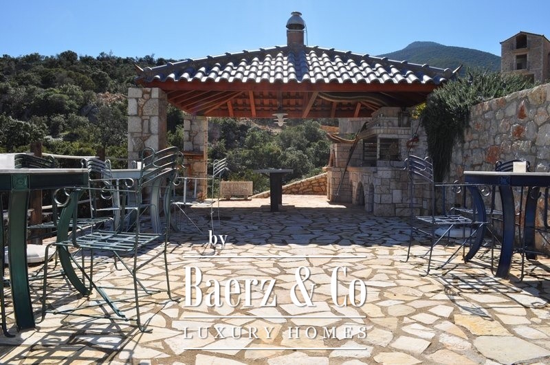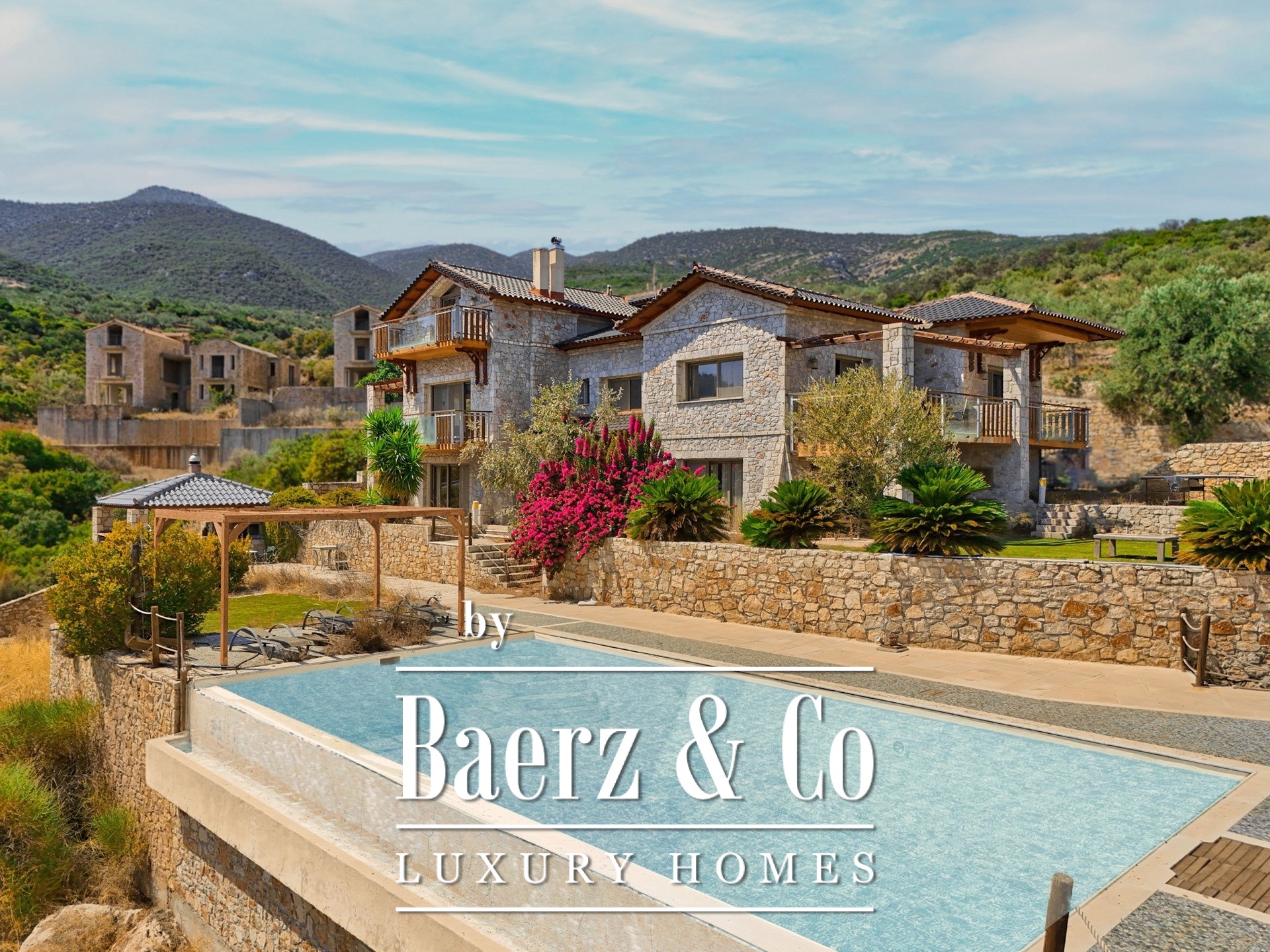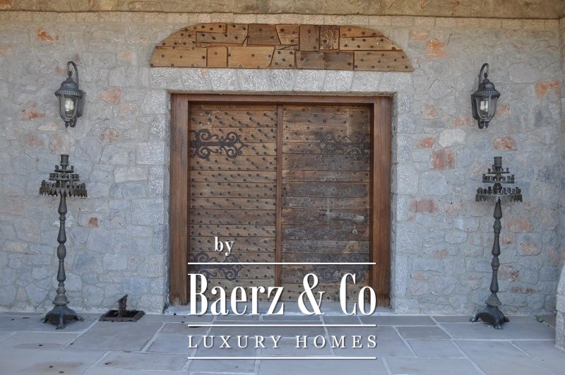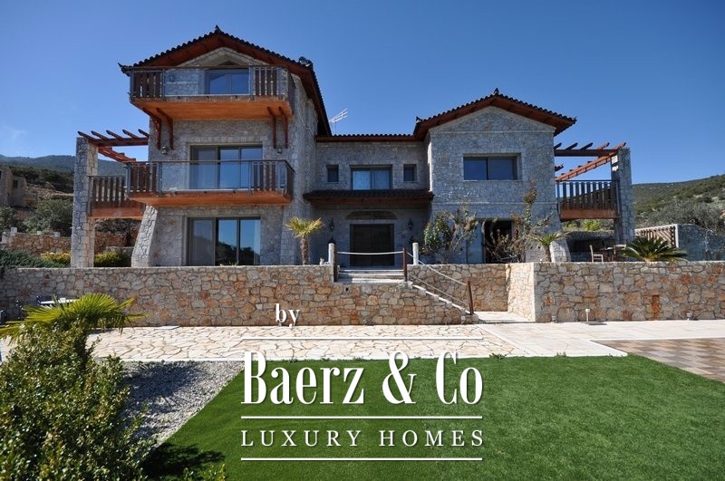 Just 1 km from the sea, in a lush olive grove, a unique stone-built villa with a total area of 380 sq m is offered for sale, built on a private plot of 9,000 sq m. The residence combines traditional architecture with modern comfort in a unique way, while the unobstructed and panoramic sea view dominates all areas. The 1st level (160 sq m) includes a bright kitchen, dining area, two living rooms with large openings, 1 WC and direct access to the well-kept garden. On the 2nd level (160 sq m) we find three spacious bedrooms – each with its own terrace – as well as areas that can be configured as an office or gym, and 2 bathrooms. The