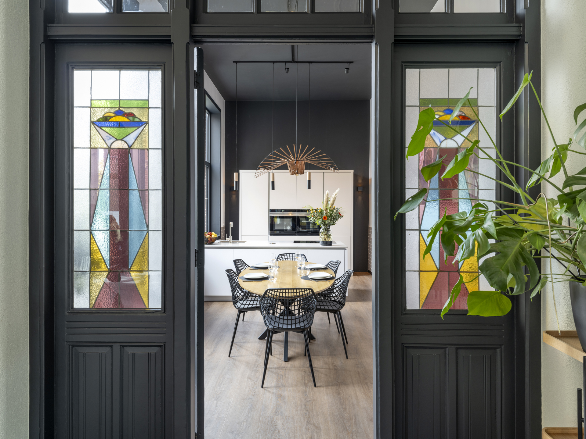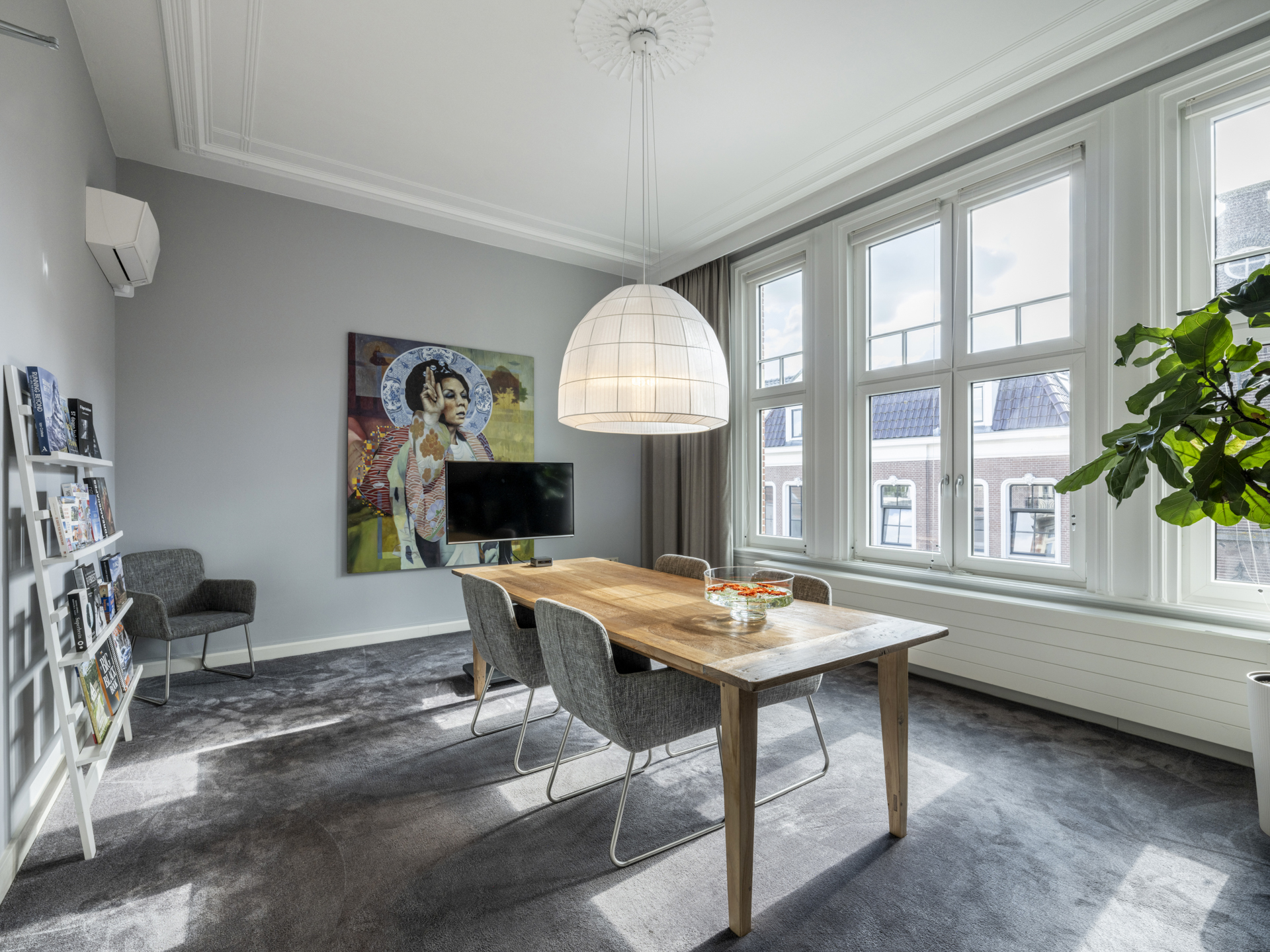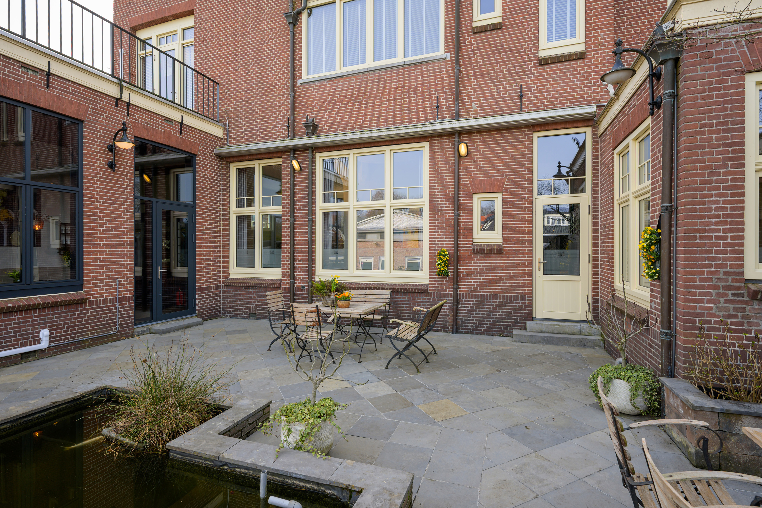 Period elements such as an original hardstone staircase, marble floors, intricate plasterwork, and leaded glass appear throughout. The flow of the home is anchored by a dramatic central hallway, with distinct living and working rooms branching off. Carefully updated, the villa marries heritage with modern comfort: high-grade insulation, HR++ double glazing, 23 solar panels, and three heating systems.
