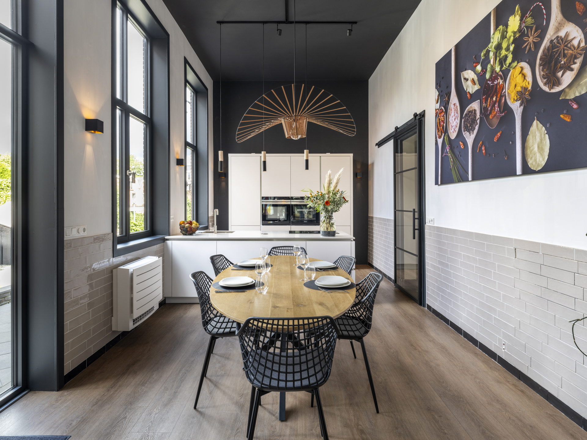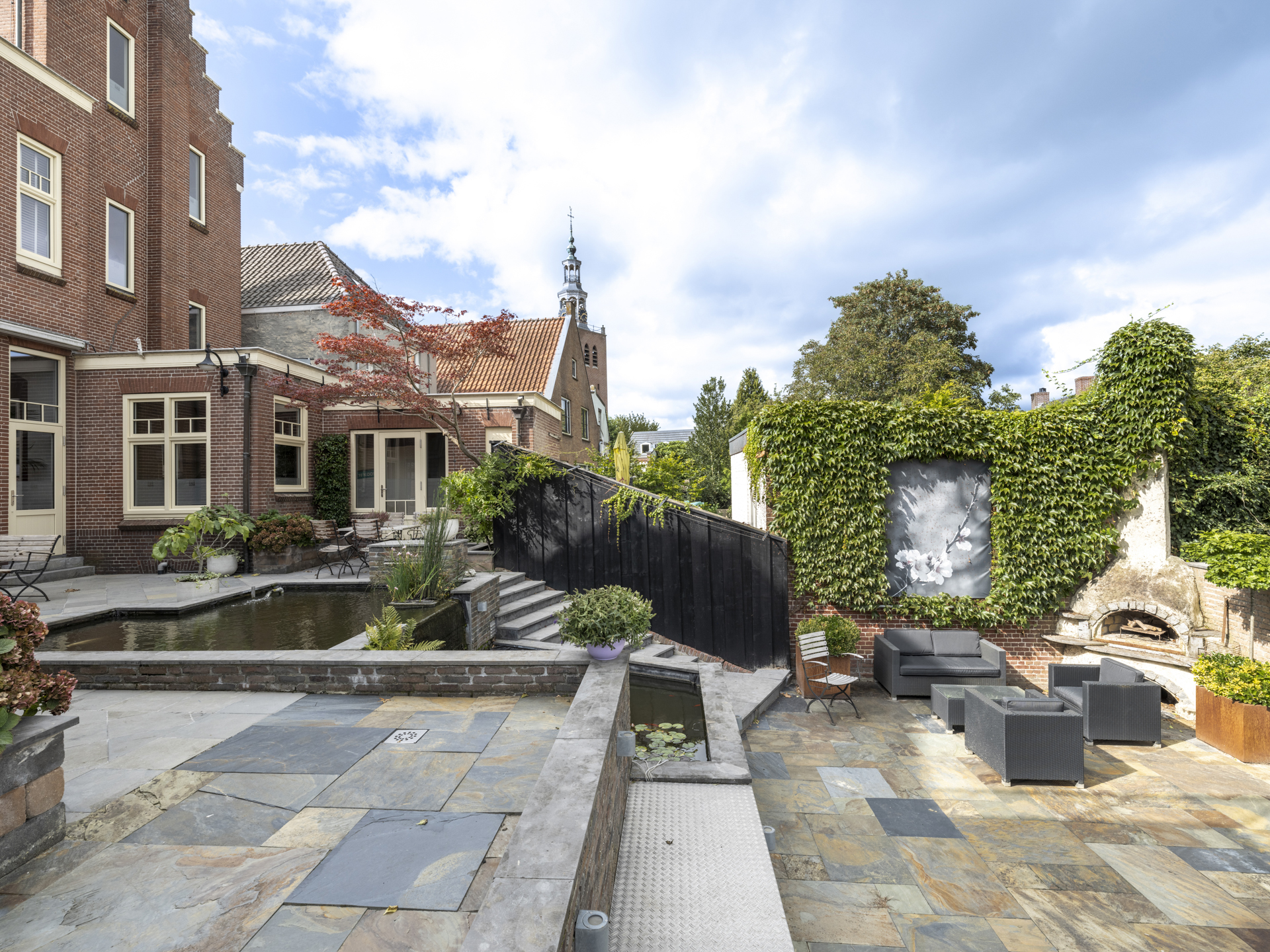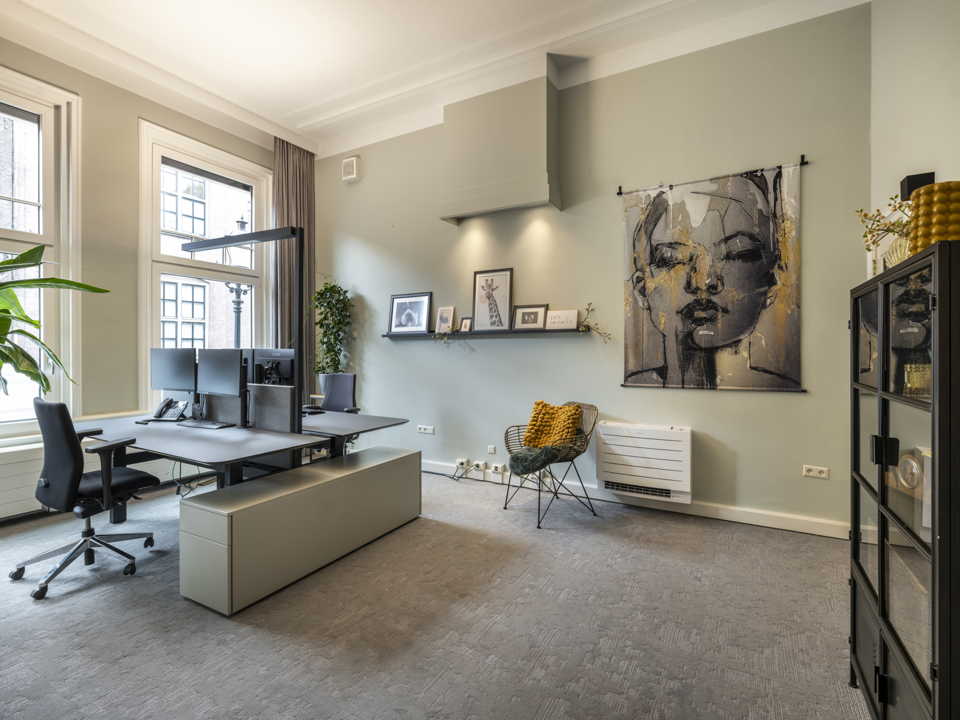 Period elements such as an original hardstone staircase, marble floors, intricate plasterwork, and leaded glass appear throughout. The flow of the home is anchored by a dramatic central hallway, with distinct living and working rooms branching off. Carefully updated, the villa marries heritage with modern comfort: high-grade insulation, HR++ double glazing, 23 solar panels, and three heating systems.